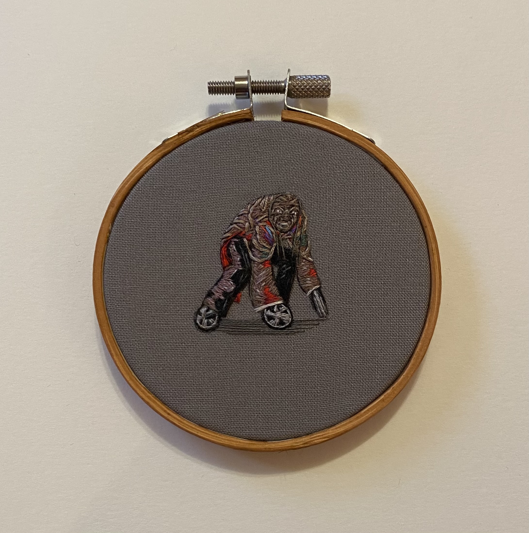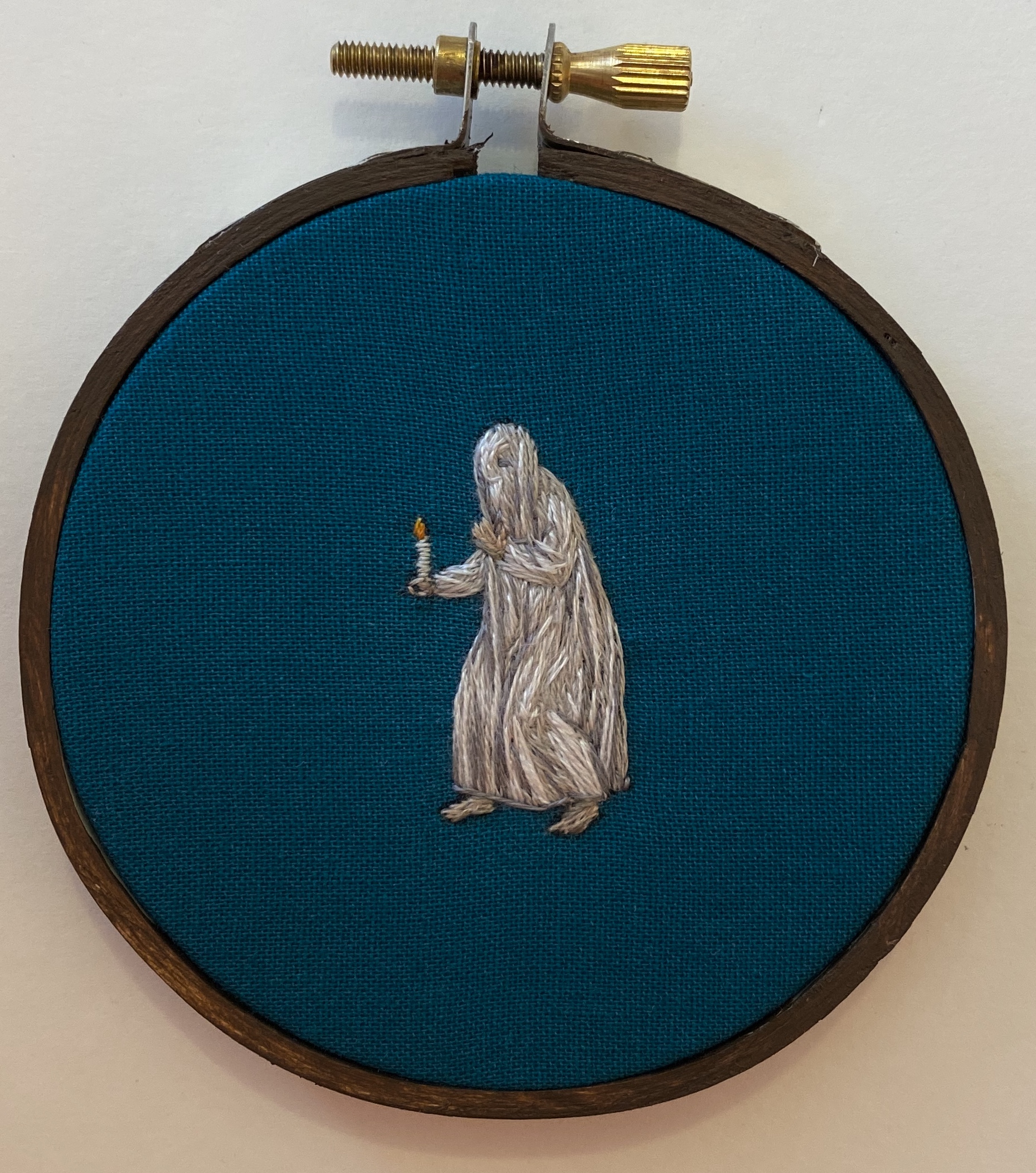 Hand embroidery mounted in a 3" hoop and ready to hang. ghost $50 wheeler $65