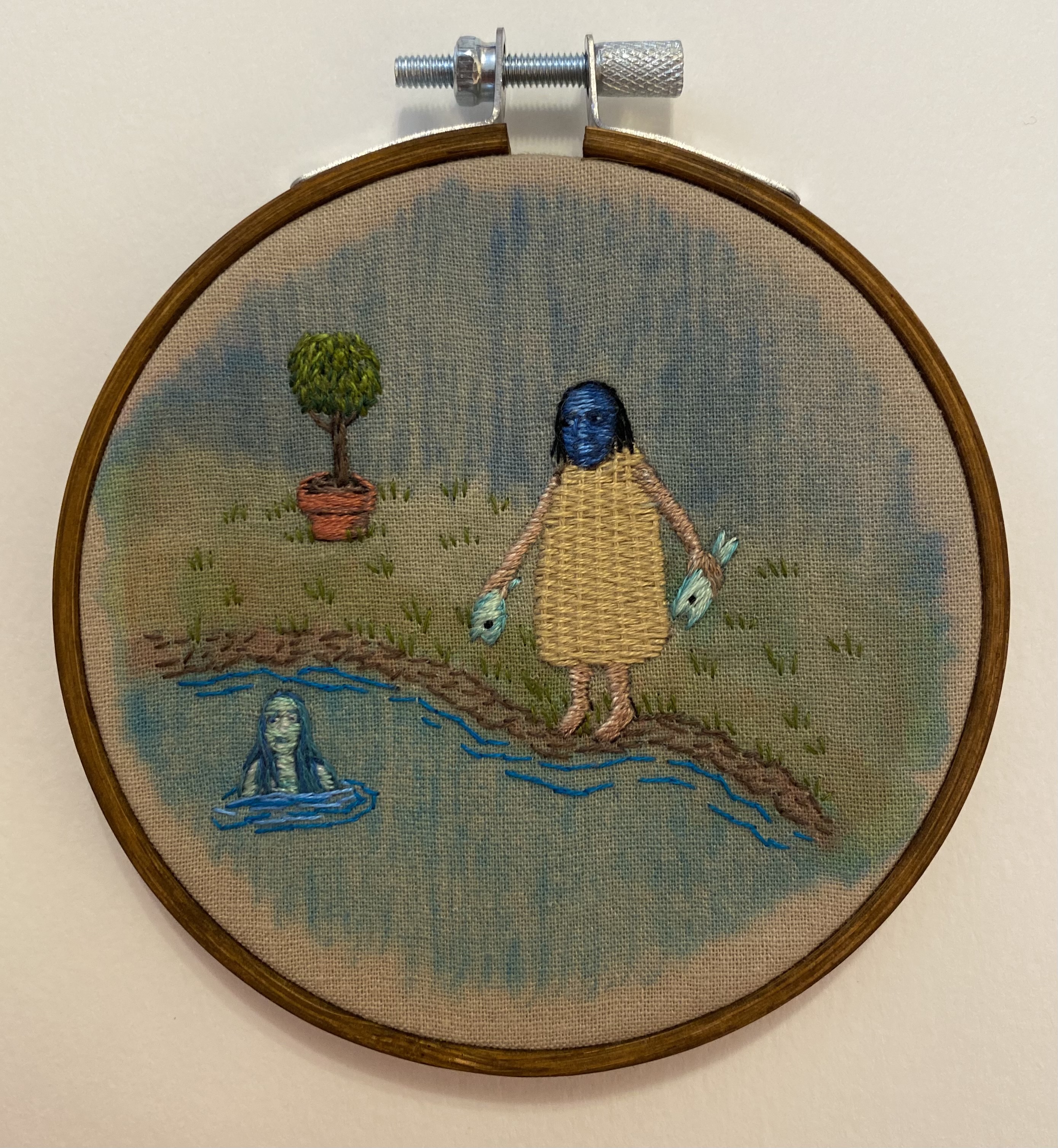 Hand embroidery, mounted in a 4" stained wooden hoop, ready to hang.