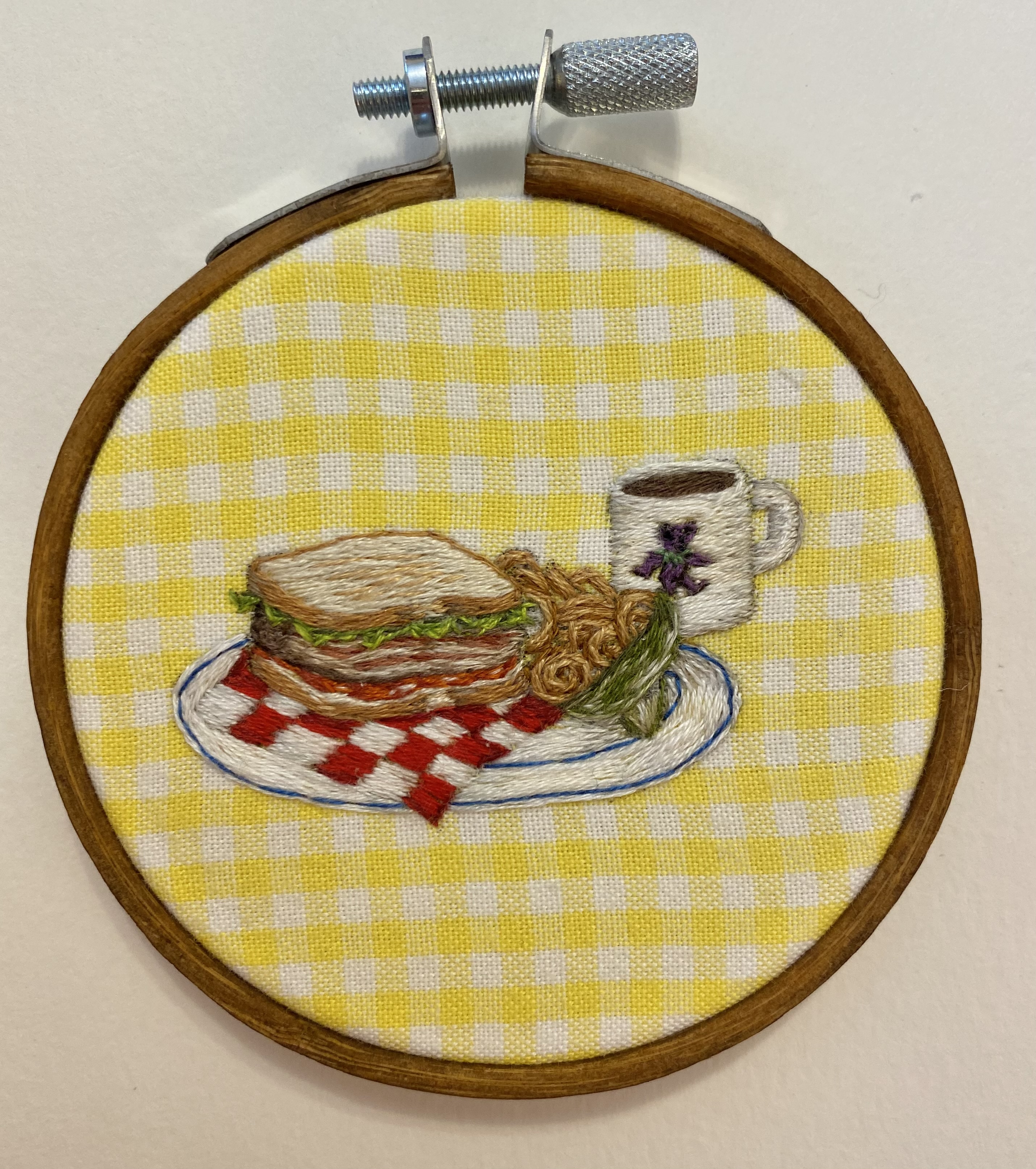 Hand embroidery mounted in a 3" stained wooden hoop, ready to hang.