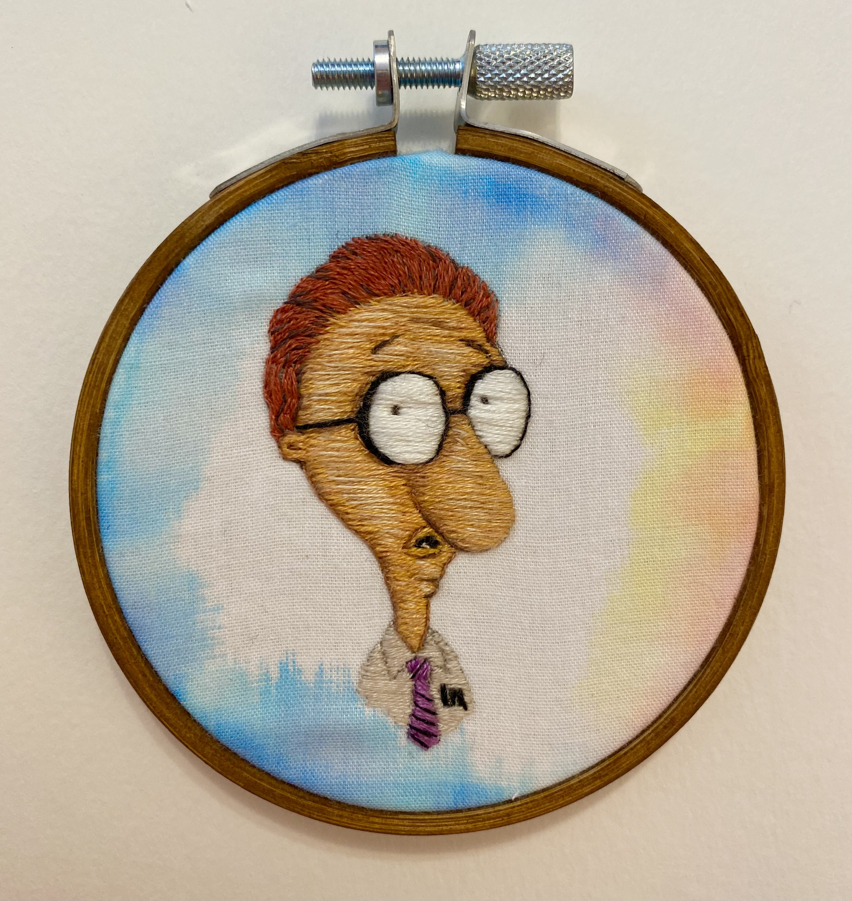 Hand embroidery on painted muslin, mounted in a 3" stained wooden hoop, ready to hang.