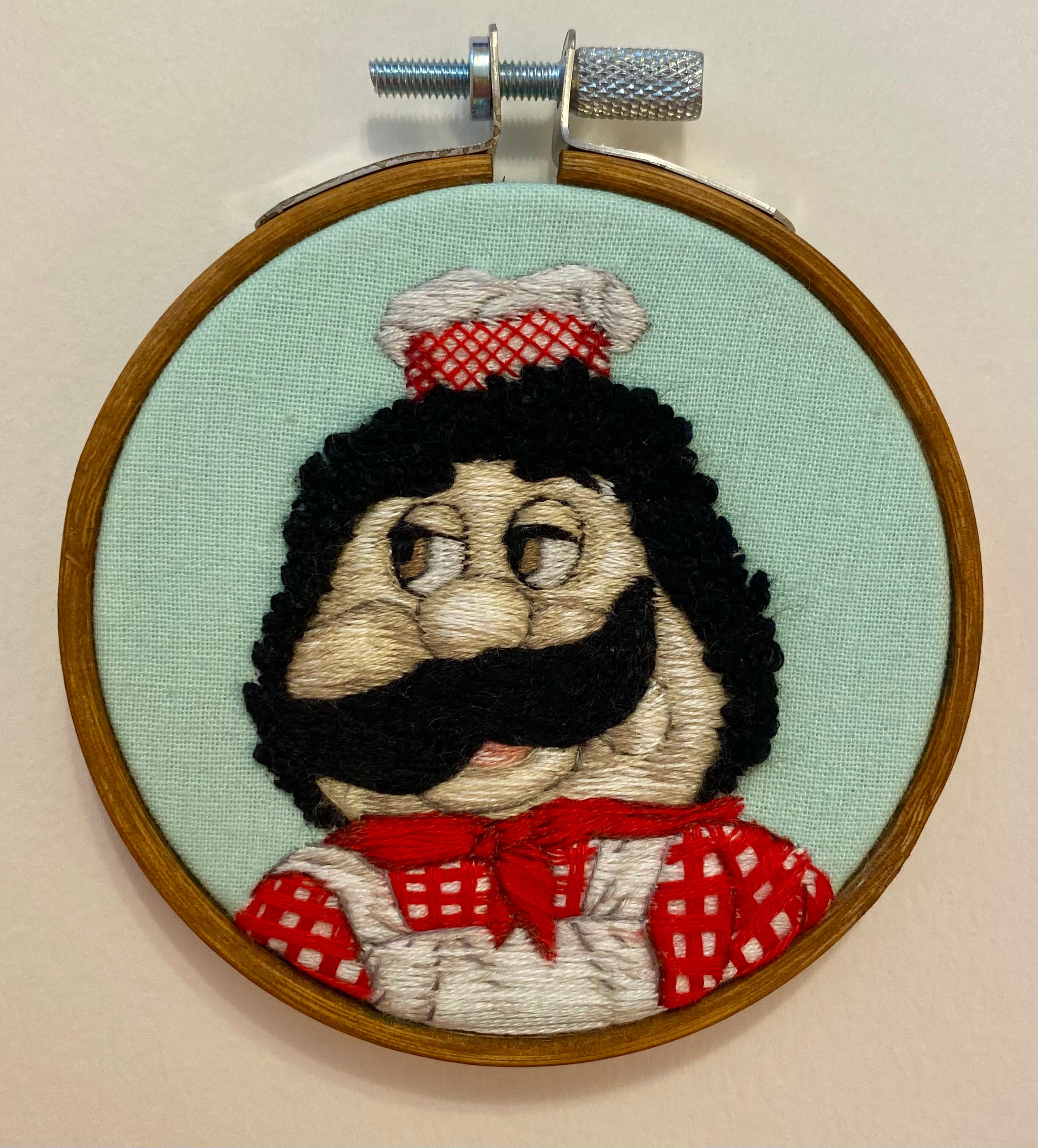 Hand embroidery, mounted in a 3" stained wooden hoop, ready to hang.