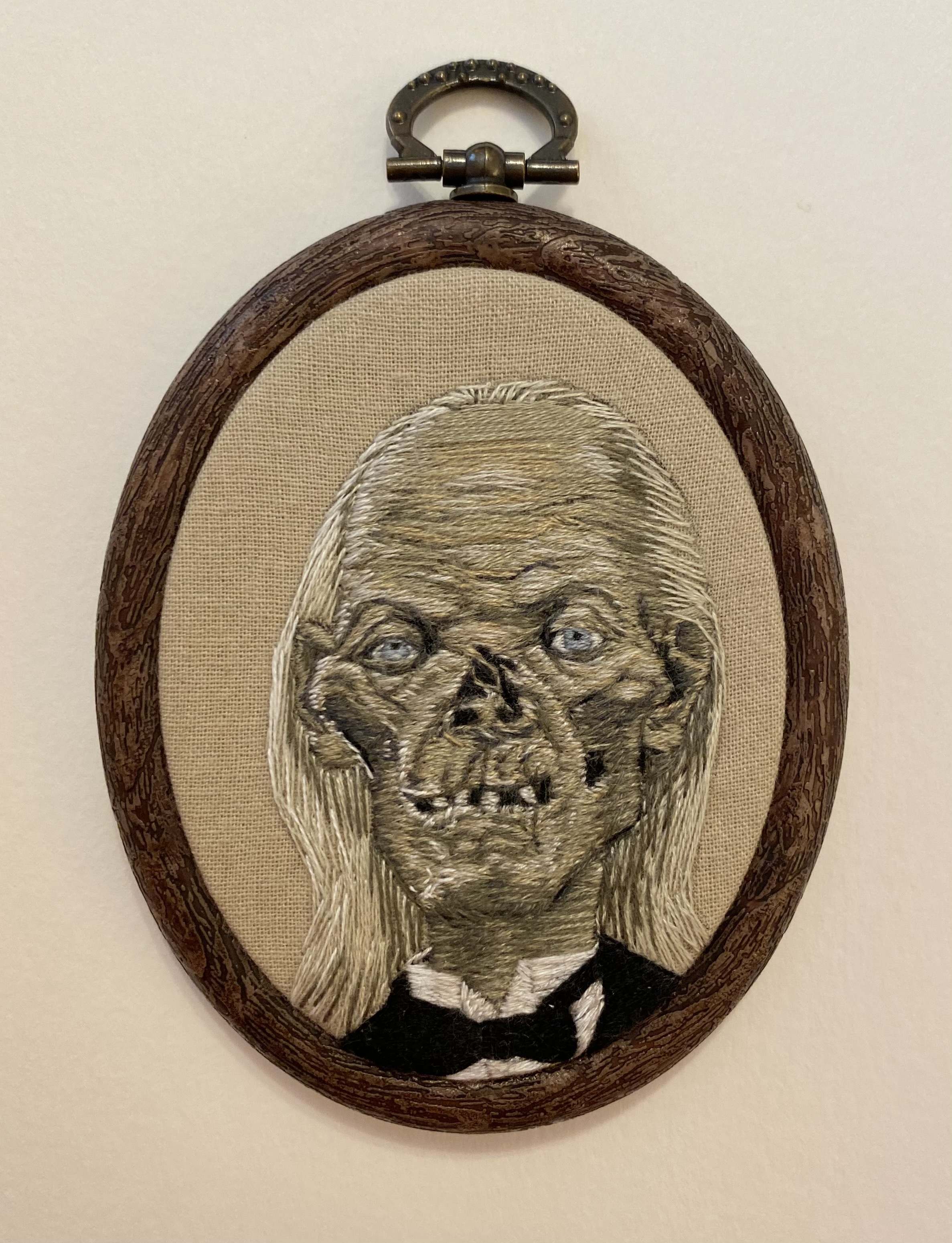 Hand embroidery mounted in a 3" oval hoop, ready to hang.