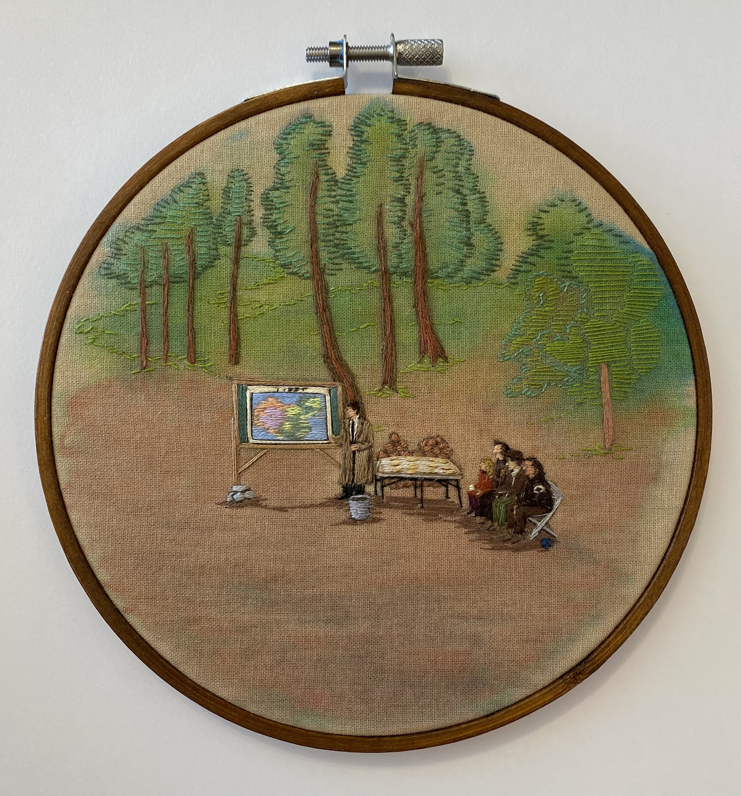 Hand embroidery on painted muslin, mounted in a stained and oiled 6" wooden hoop, and ready to hang.