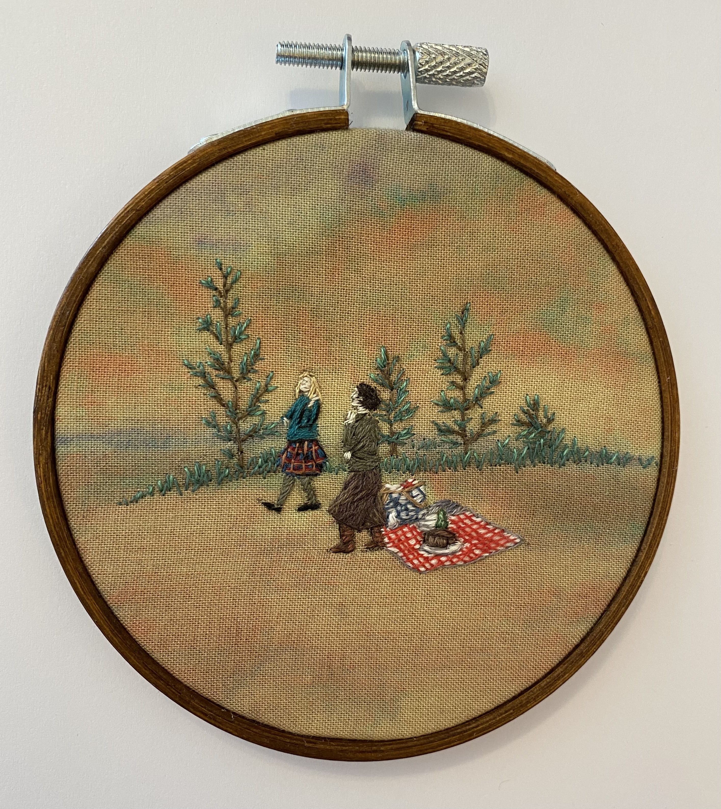 Hand embroidery on painted muslin, mounted in a stained and oiled 4" wooden hoop, and ready to hang.