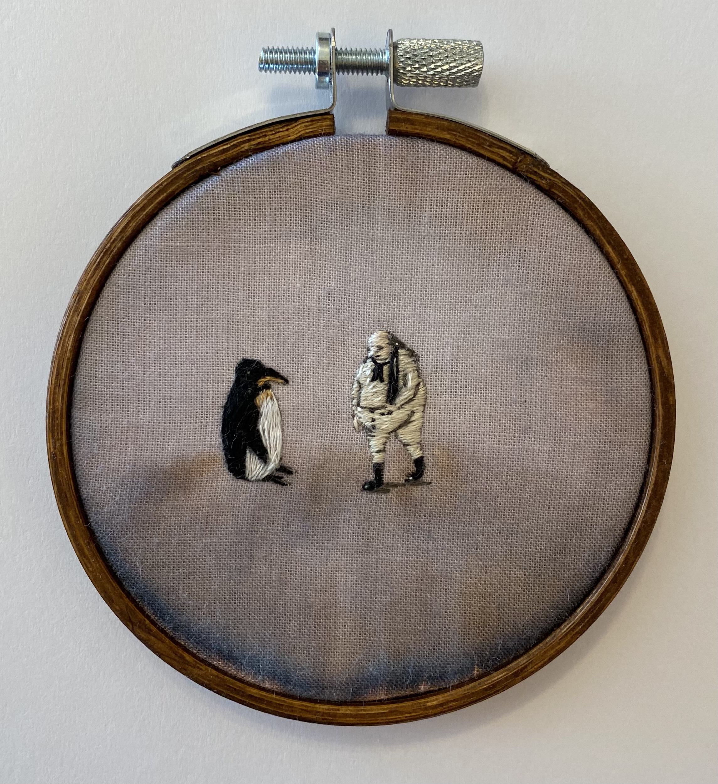 Hand embroidery on painted muslin, mounted in a stained and oiled 3" wooden hoop, ready to hang.