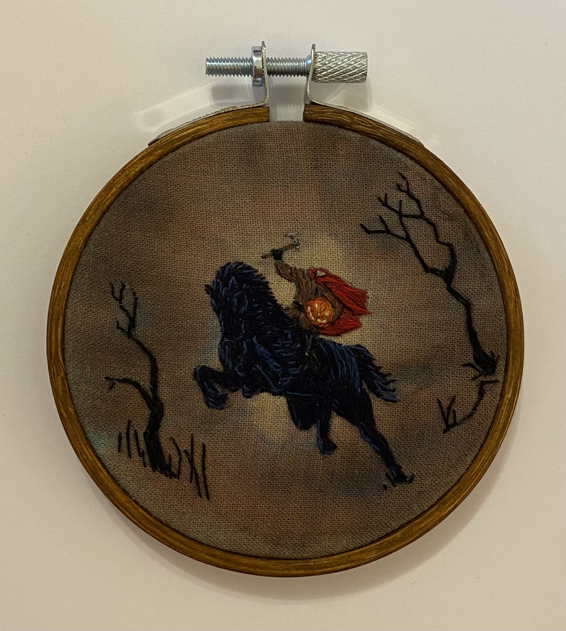 Hand embroidery on hand dyed muslin, mounted in a 3" stained hoop and ready to hang.