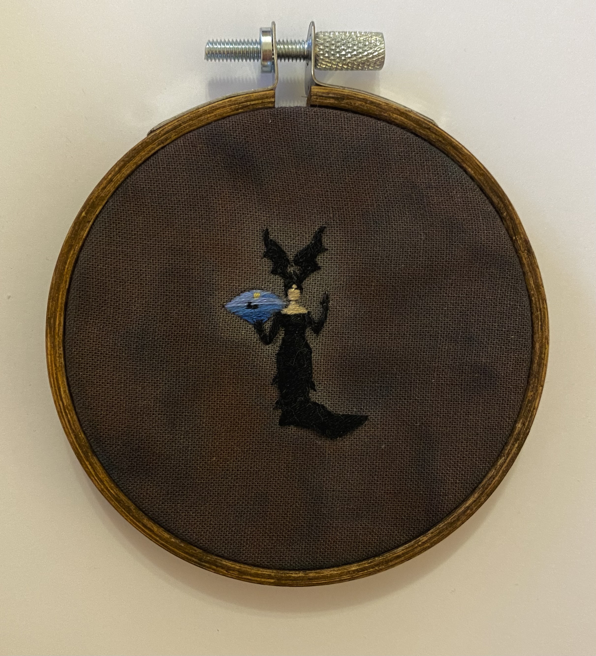 Hand embroidery on hand dyed muslin, mounted in a 3" stained wooden hoop and ready to hang.