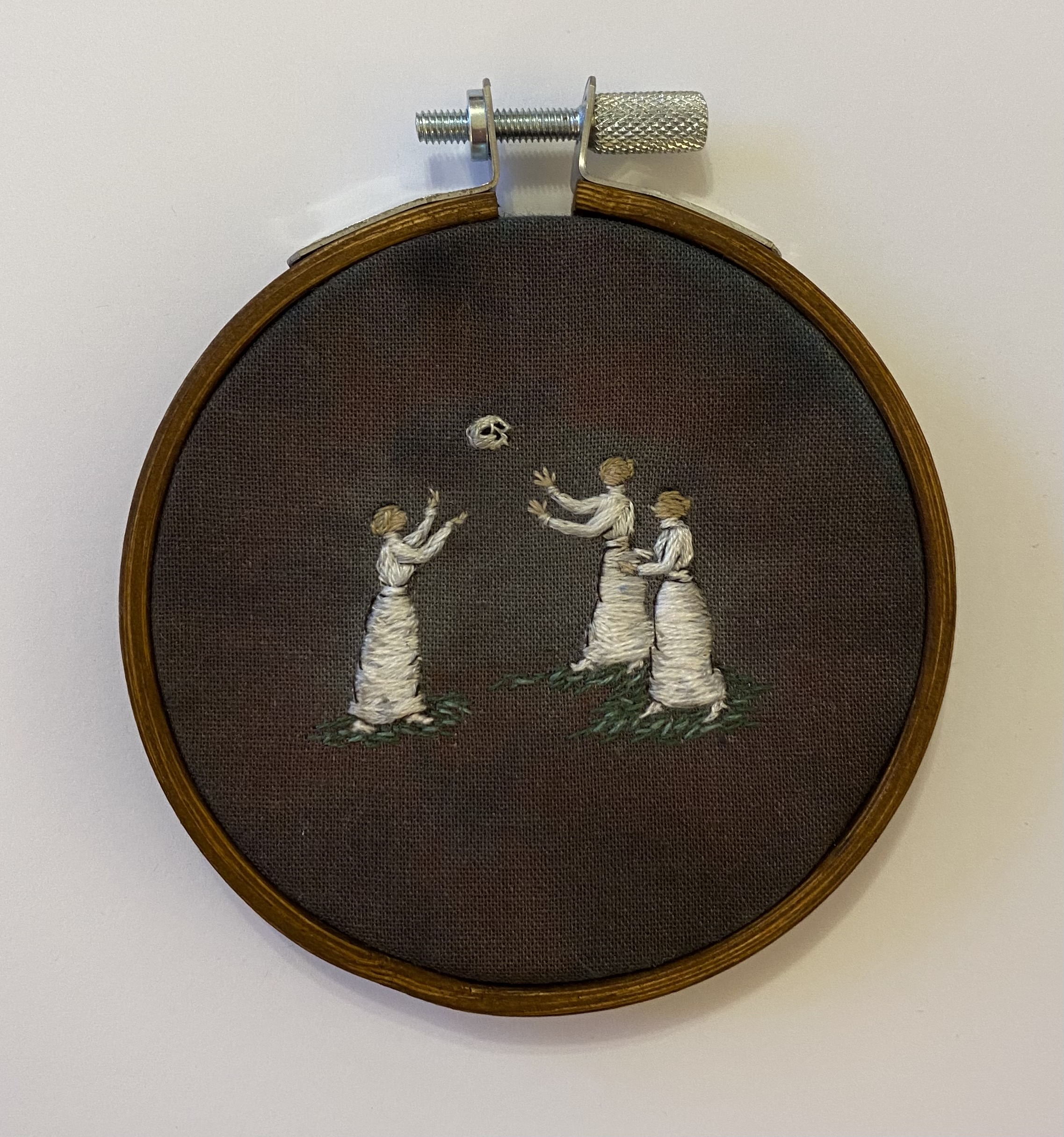 Hand embroidery on hand dyed muslin, mounted in a 3" stained wooden hoop and ready to hang.