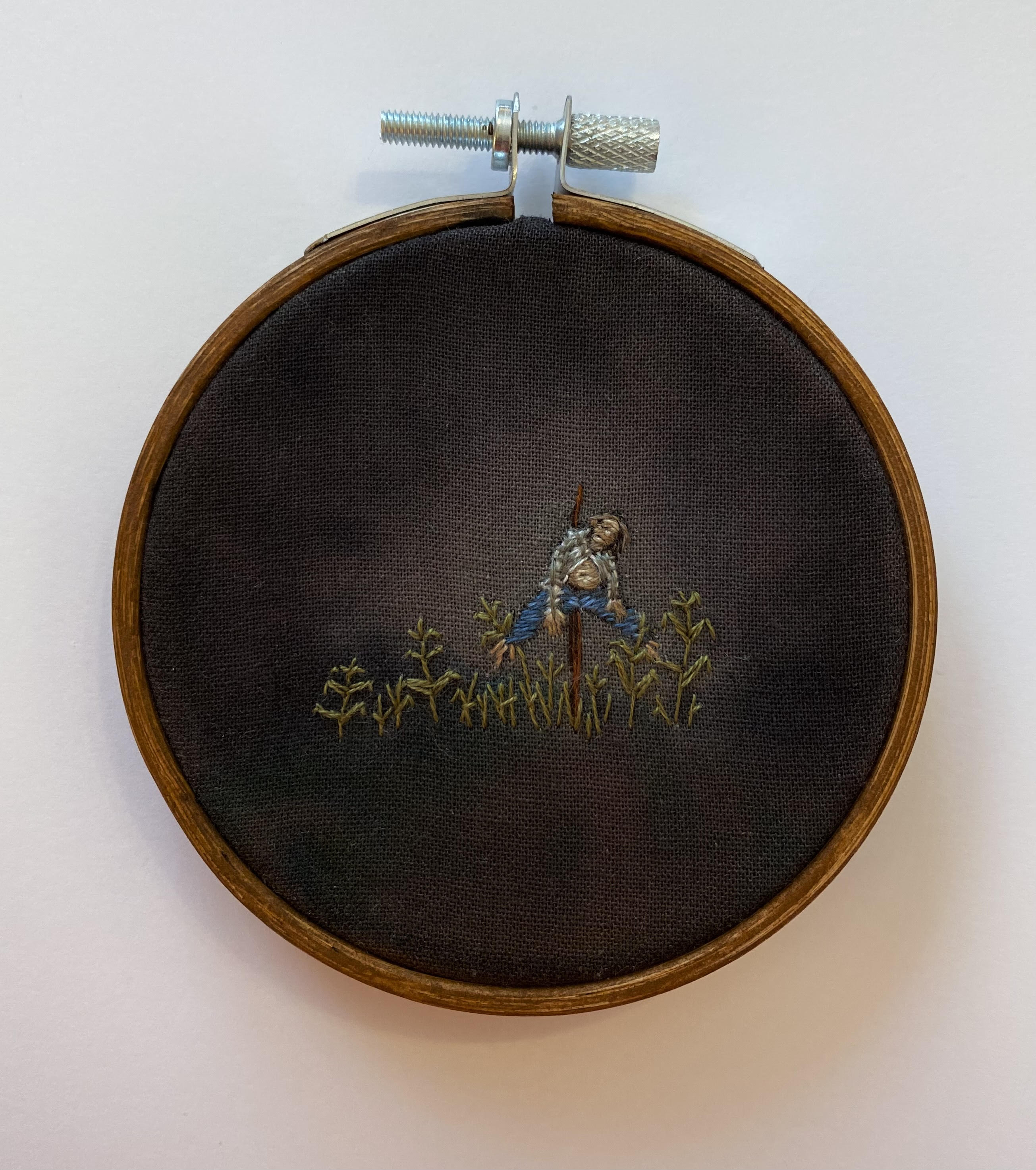 Hand embroidery on hand dyed muslin, mounted in a 3" stained wooden hoop and ready to hang.