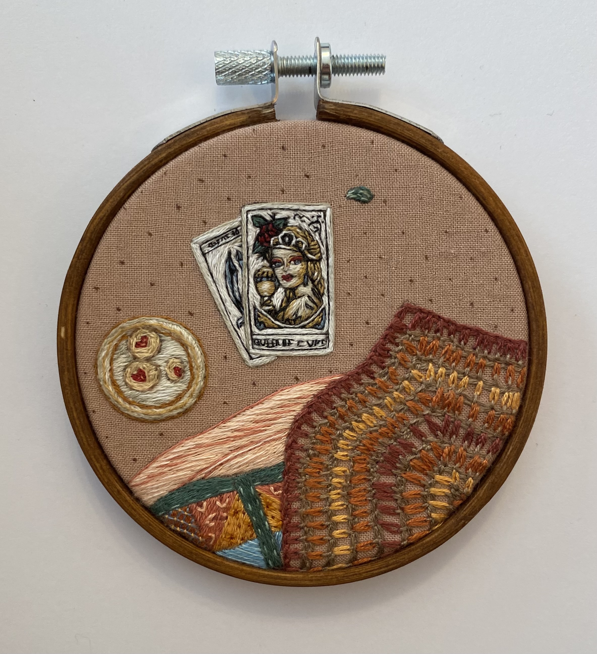 Hand embroidery mounted in a 3" stained wooden hoop and ready to hang.