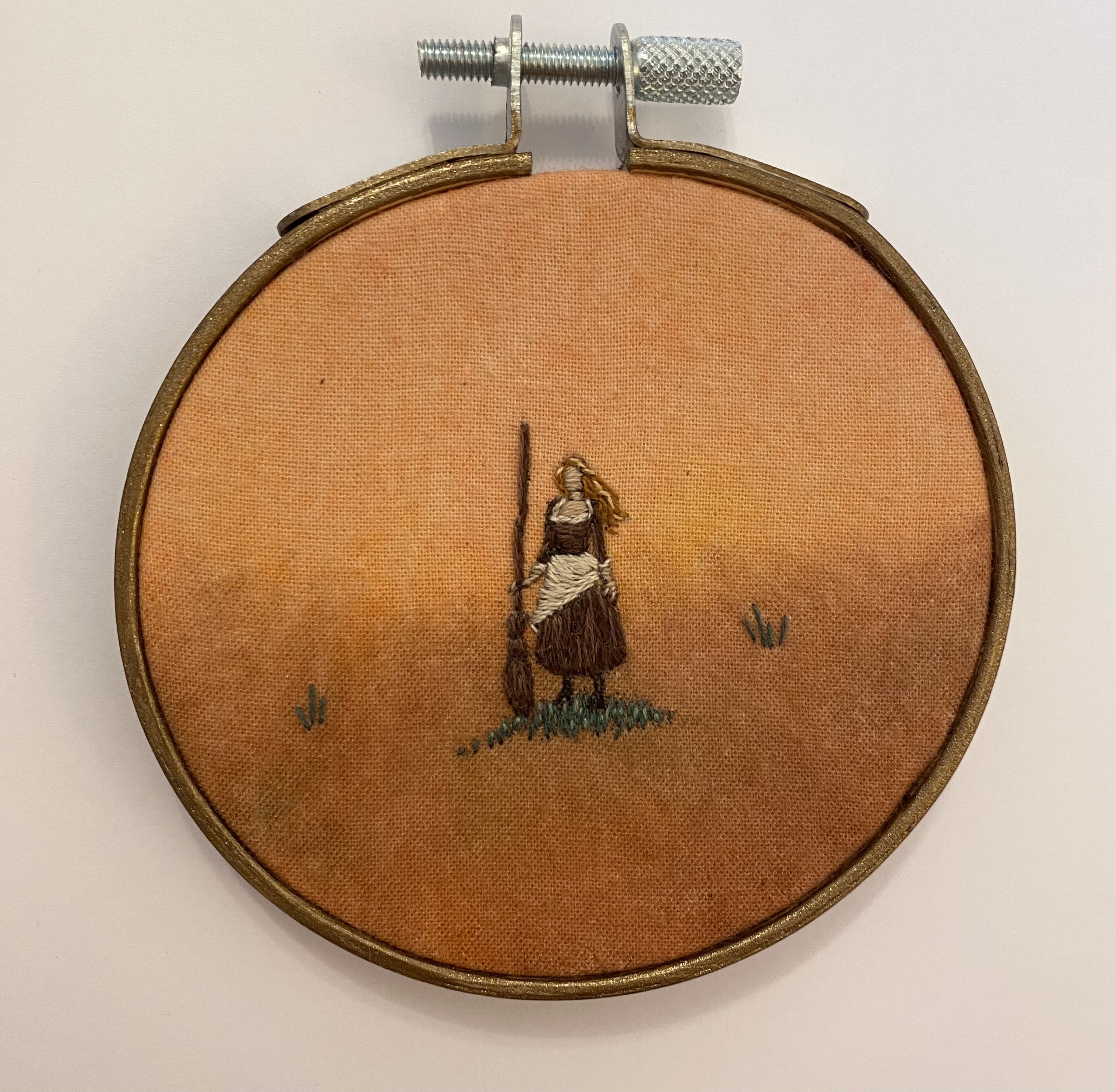 Hand embroidery on dyed muslin, mounted in a 3" wooden hoop and ready to hang.