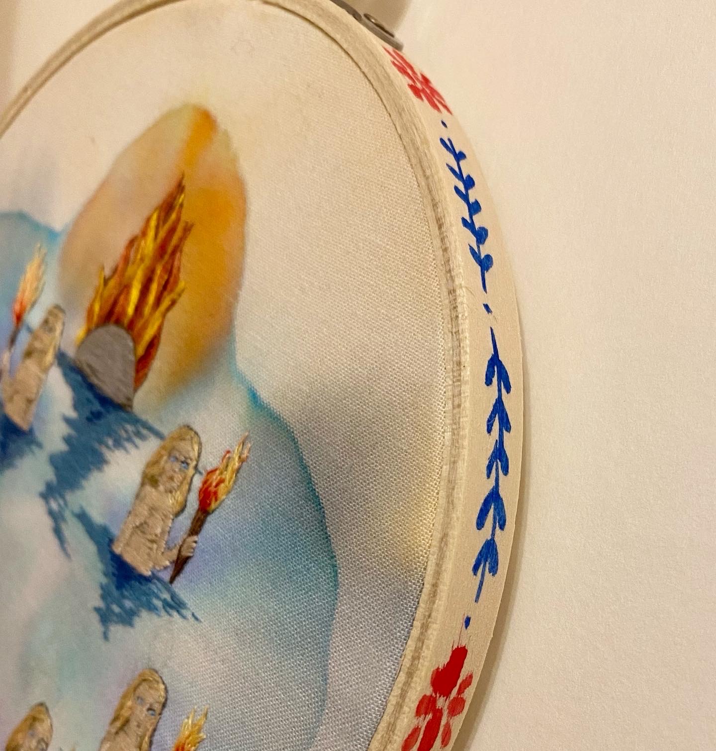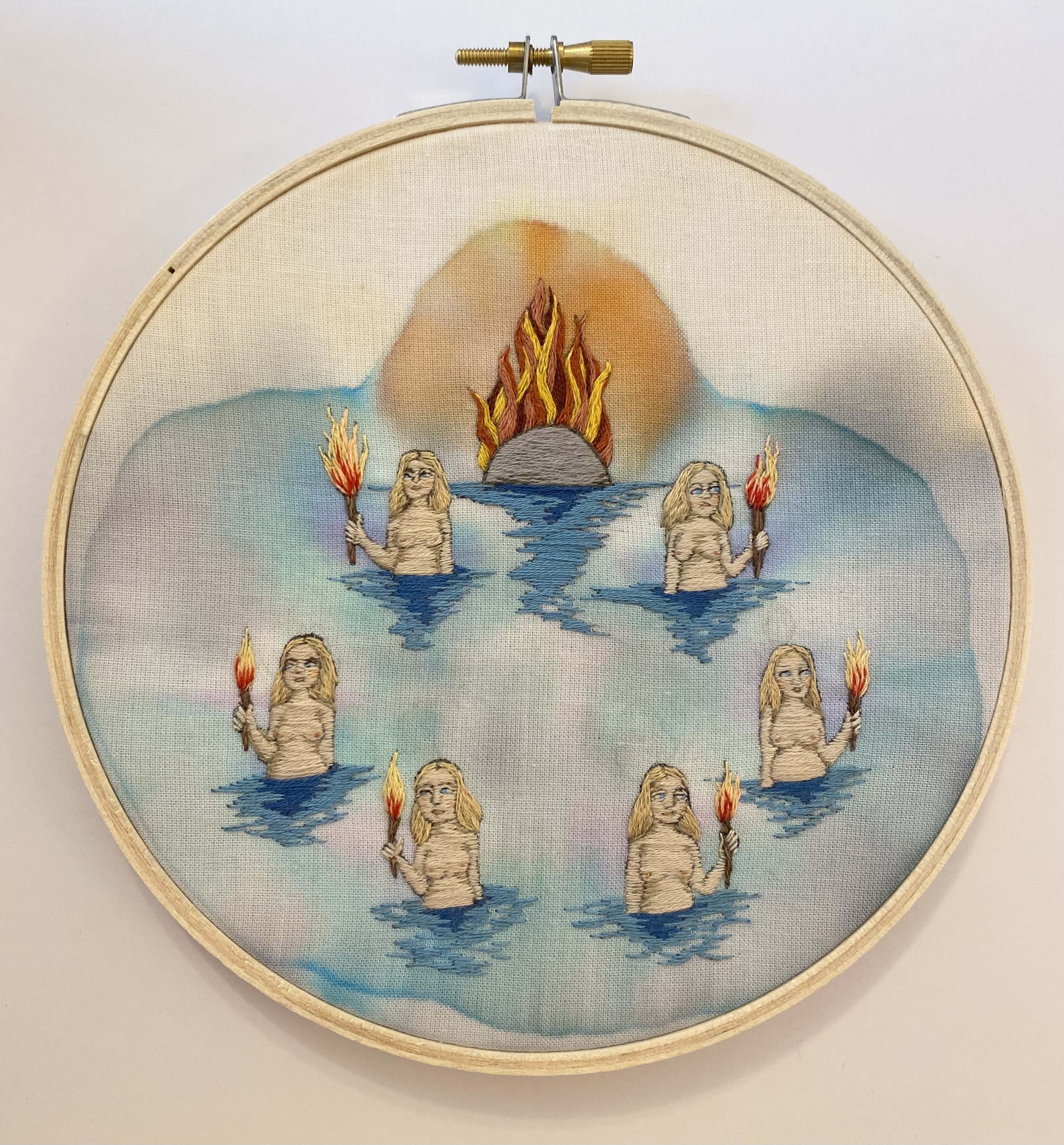 Hand embroidery on painted muslin, mounted in a 6" painted wooden hoop and ready to hang.