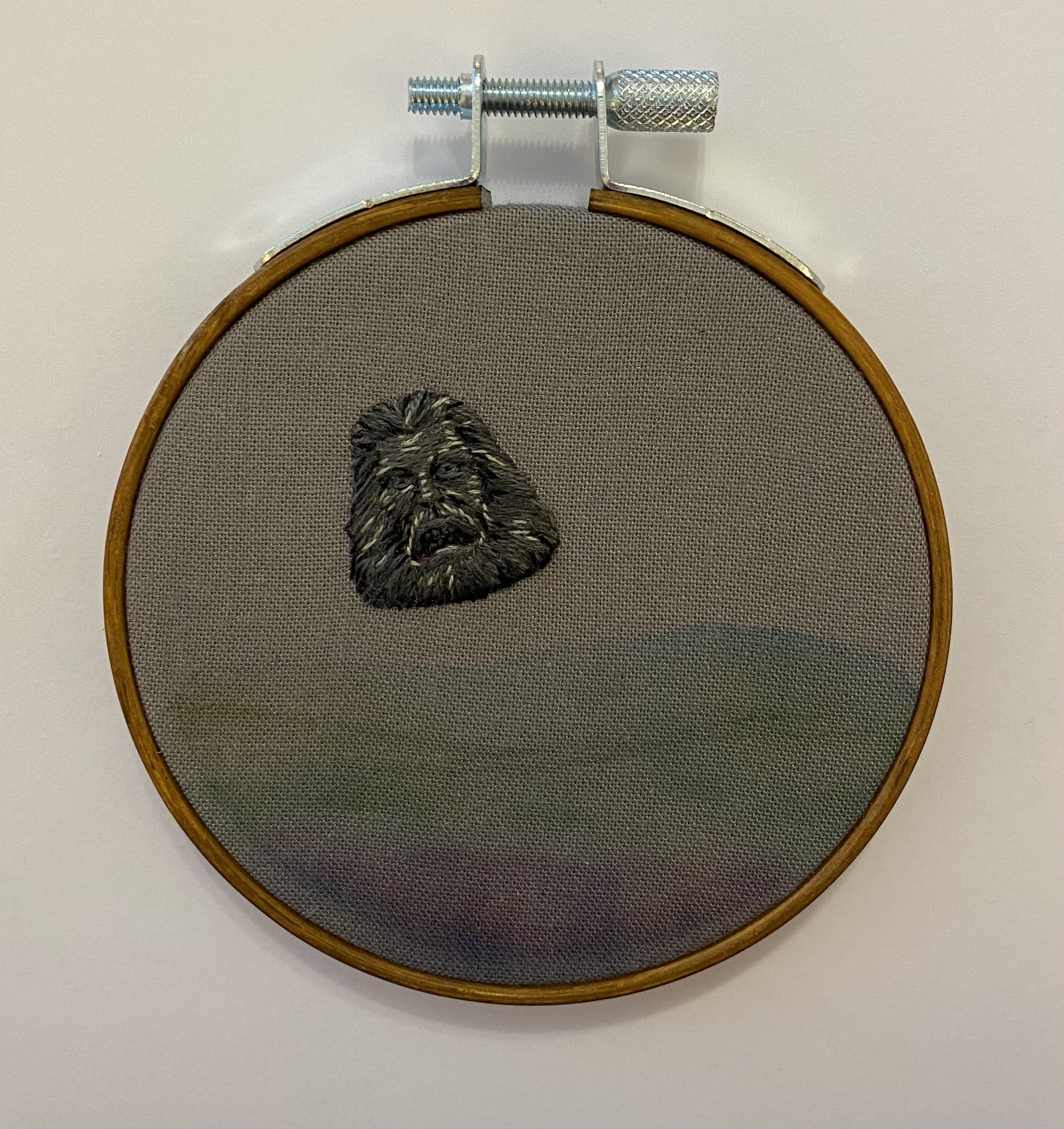 Hand embroidery on painted muslin, mounted in a 3" stained wooden hoop and ready to hang.