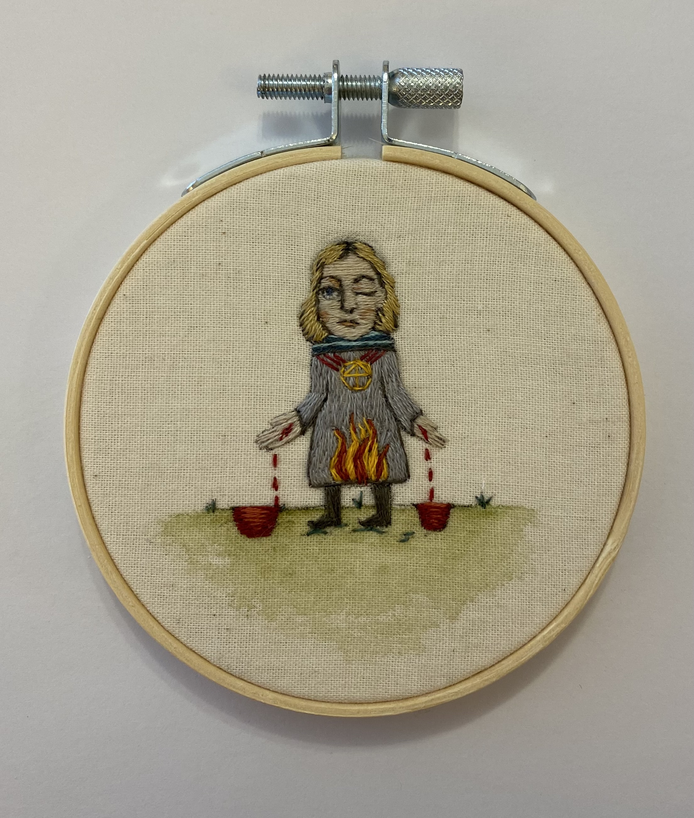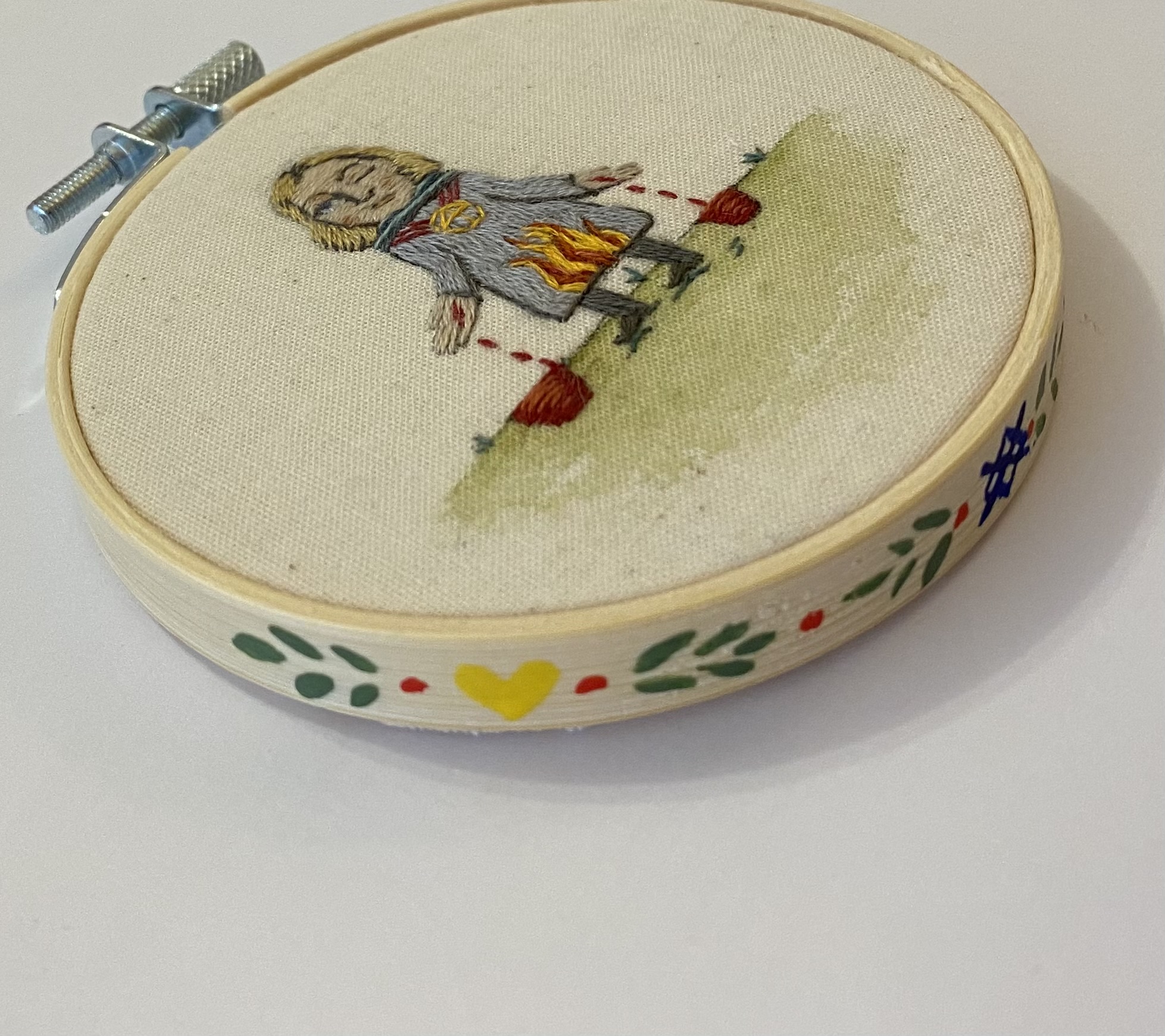 Hand embroidery on painted muslin, mounted in a 3" painted wooden hoop and ready to hang.