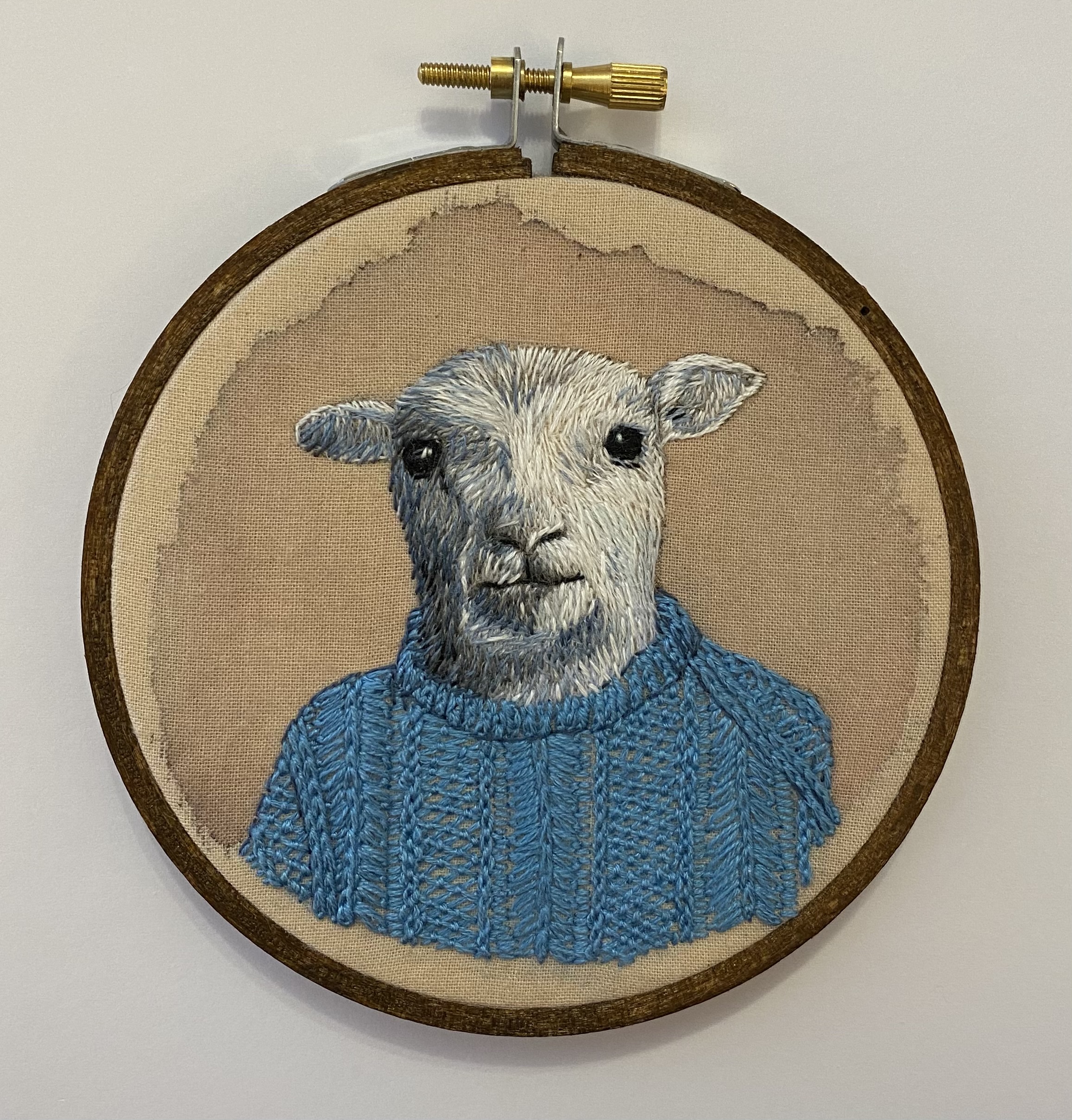 Hand embroidery on painted muslin, mounted in a stained 4" hoop and ready to hang.