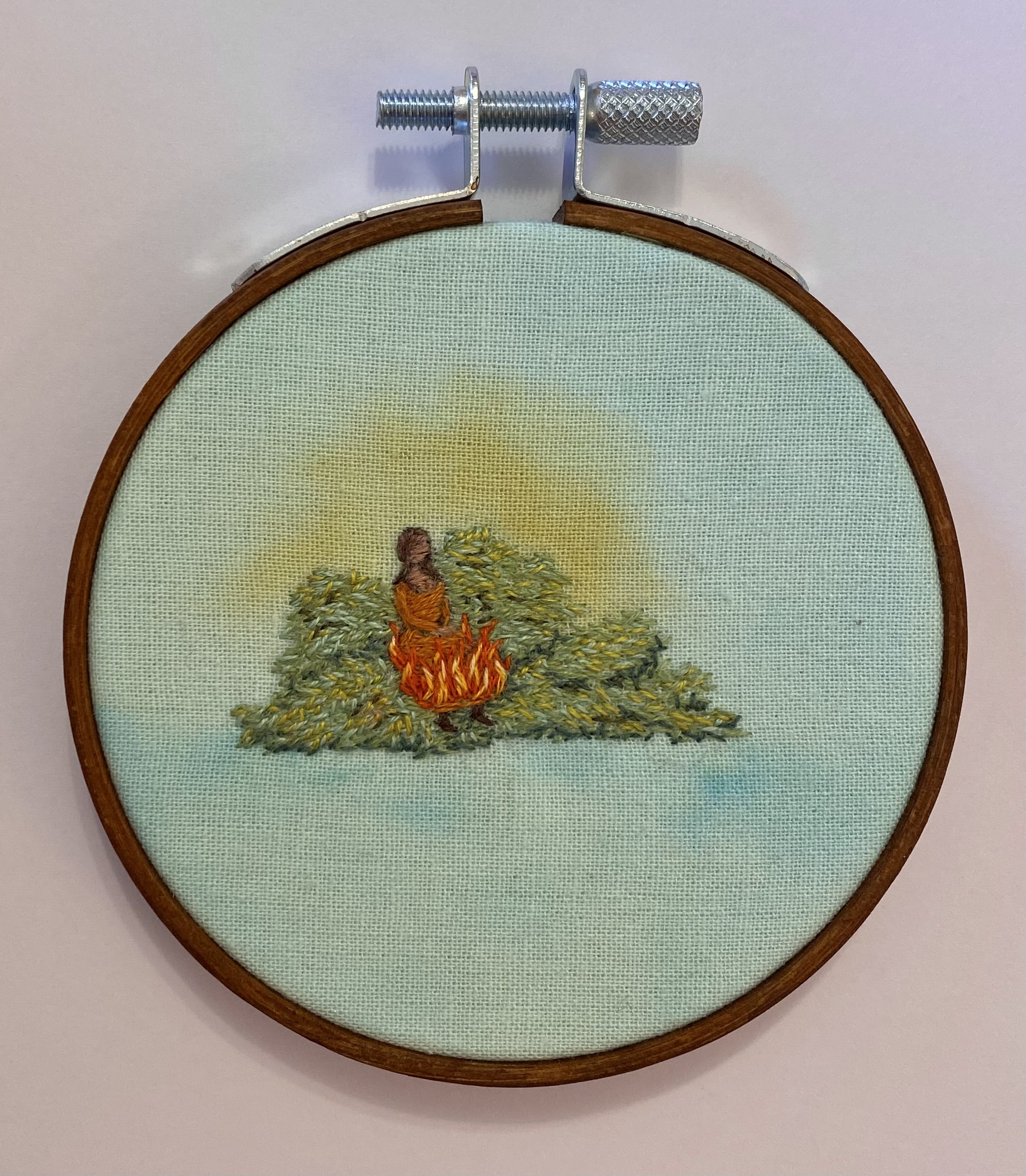 Hand embroidery on painted muslin, mounted in a stained 3" hoop and ready to hang.