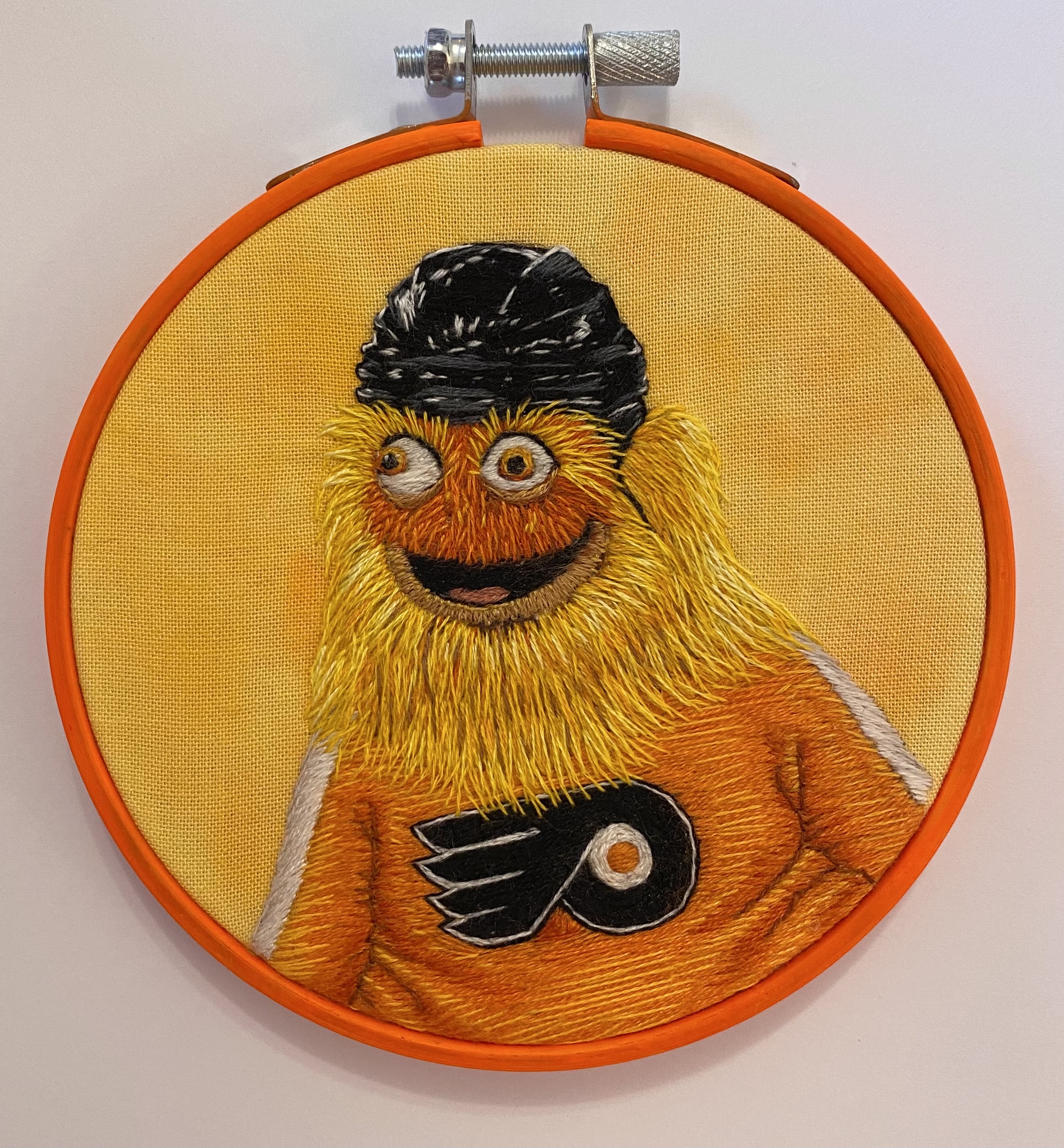 Hand embroidery on dyed cotton, mounted in a painted 4" wooden hoop and ready to hang.