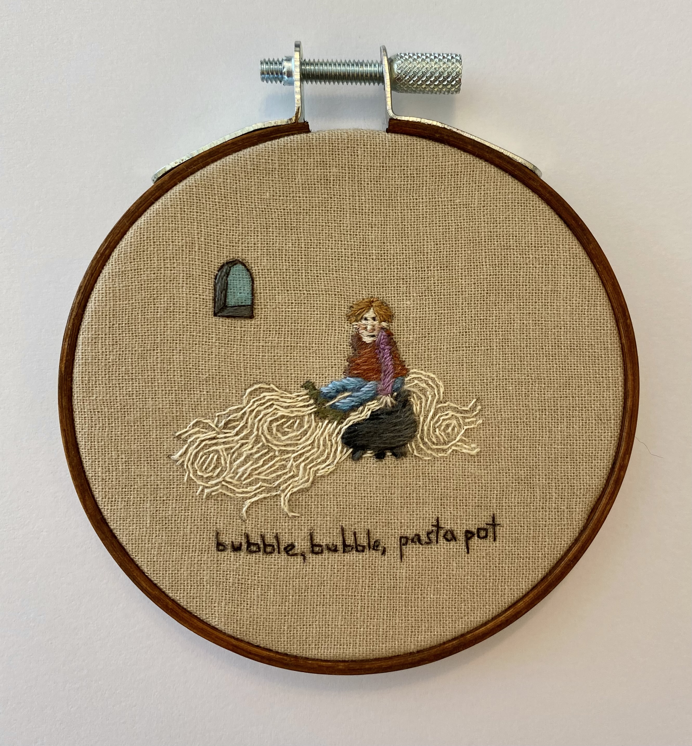 Hand embroidery on muslin, mounted in a 3" stained wooden hoop and ready to hang.