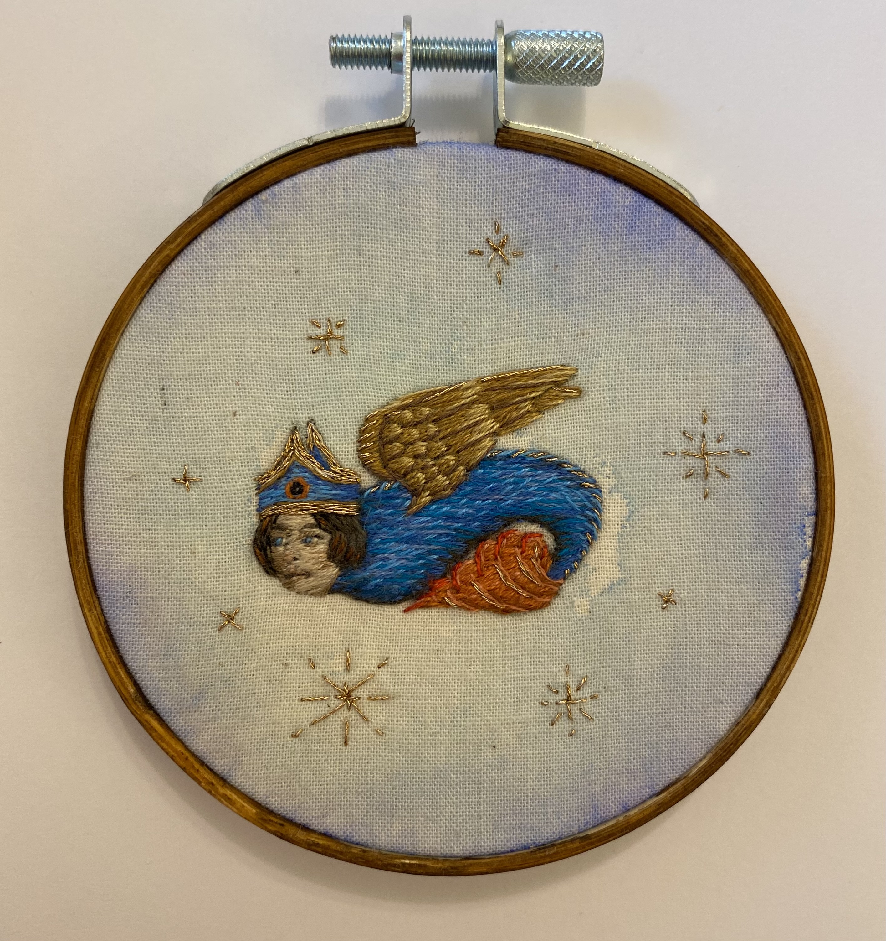 Hand embroidery on painted muslin, mounted in a 3" hoop and ready to hang.