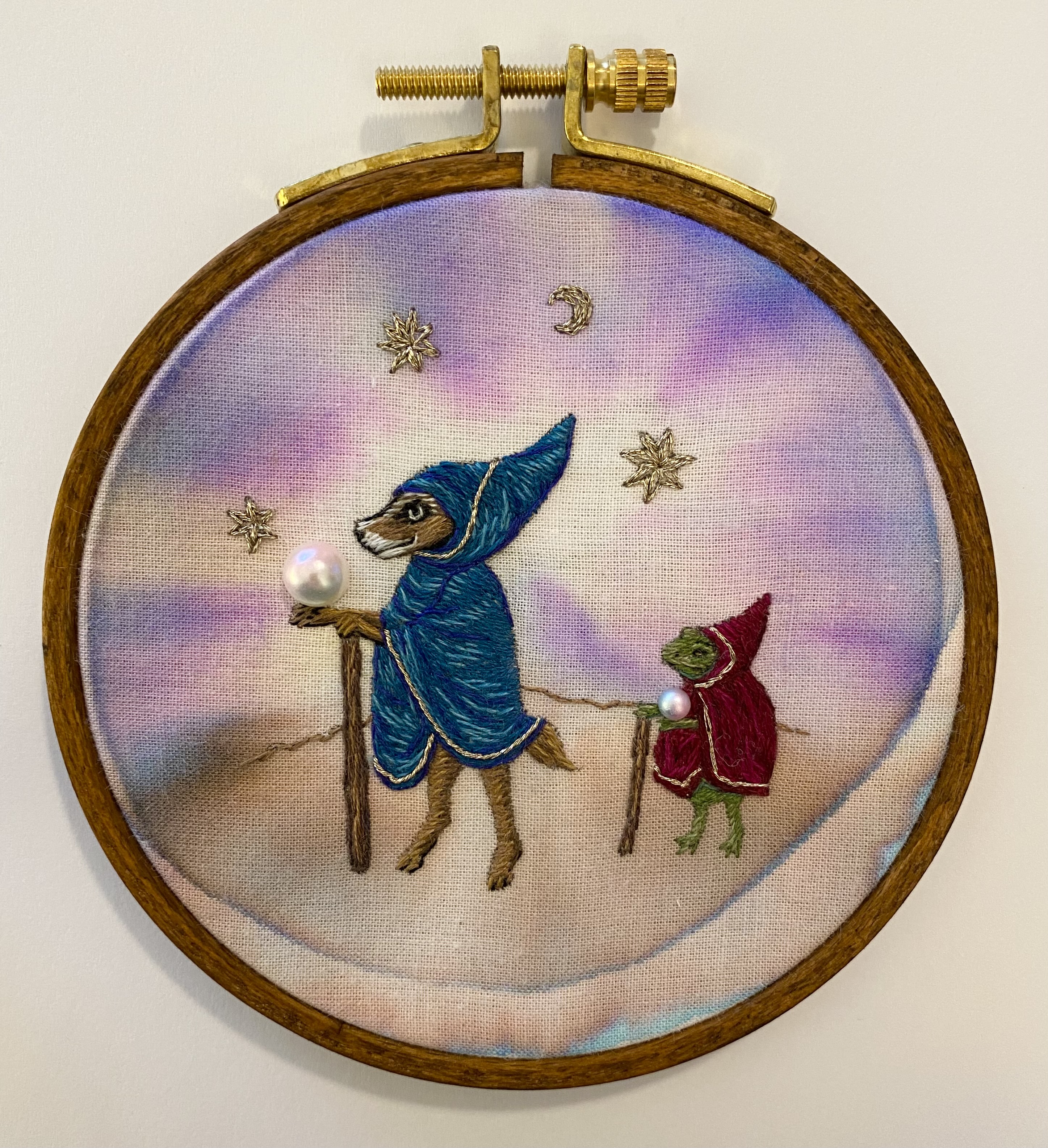 Hand embroidery on painted muslin, mounted in a 4" hoop and ready to hang.