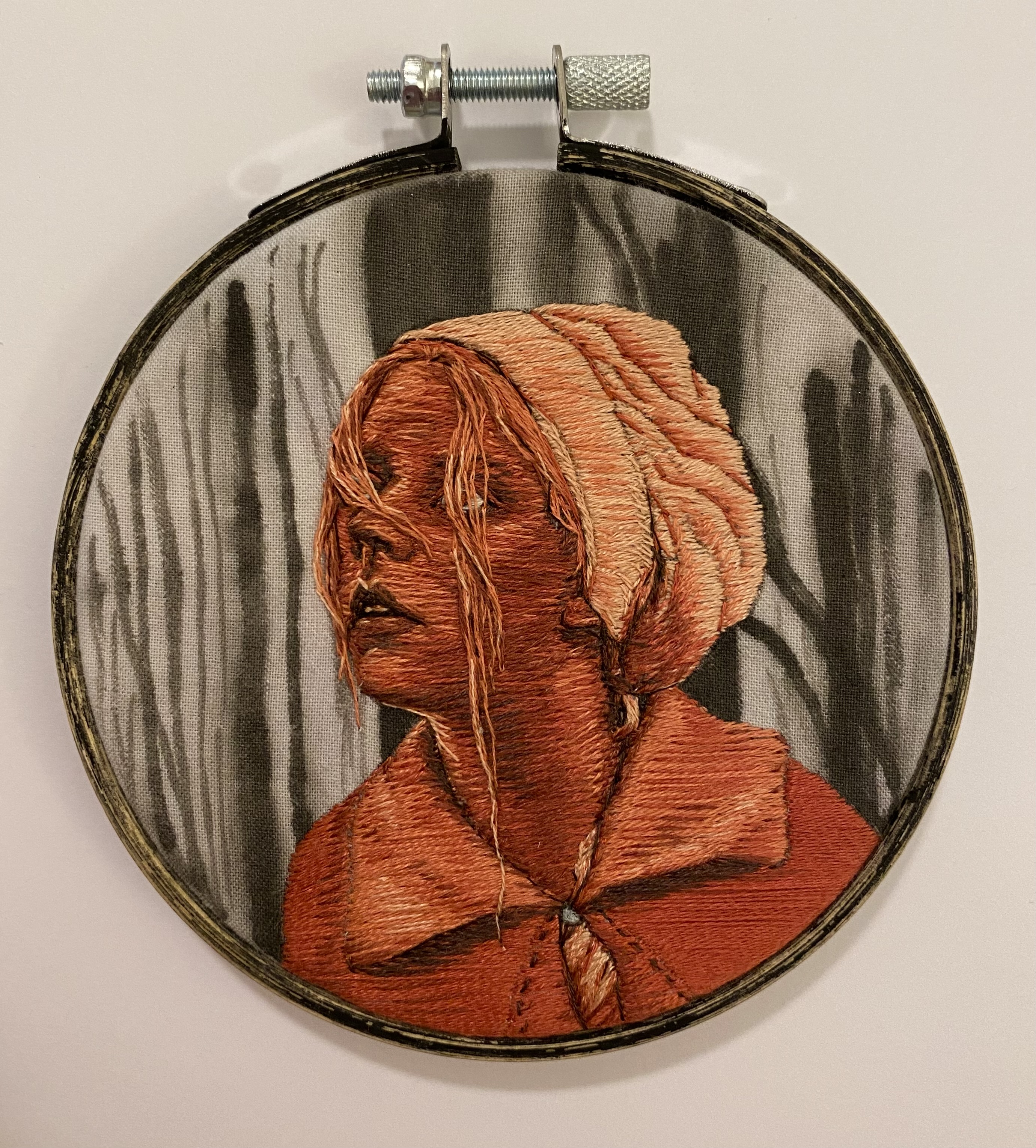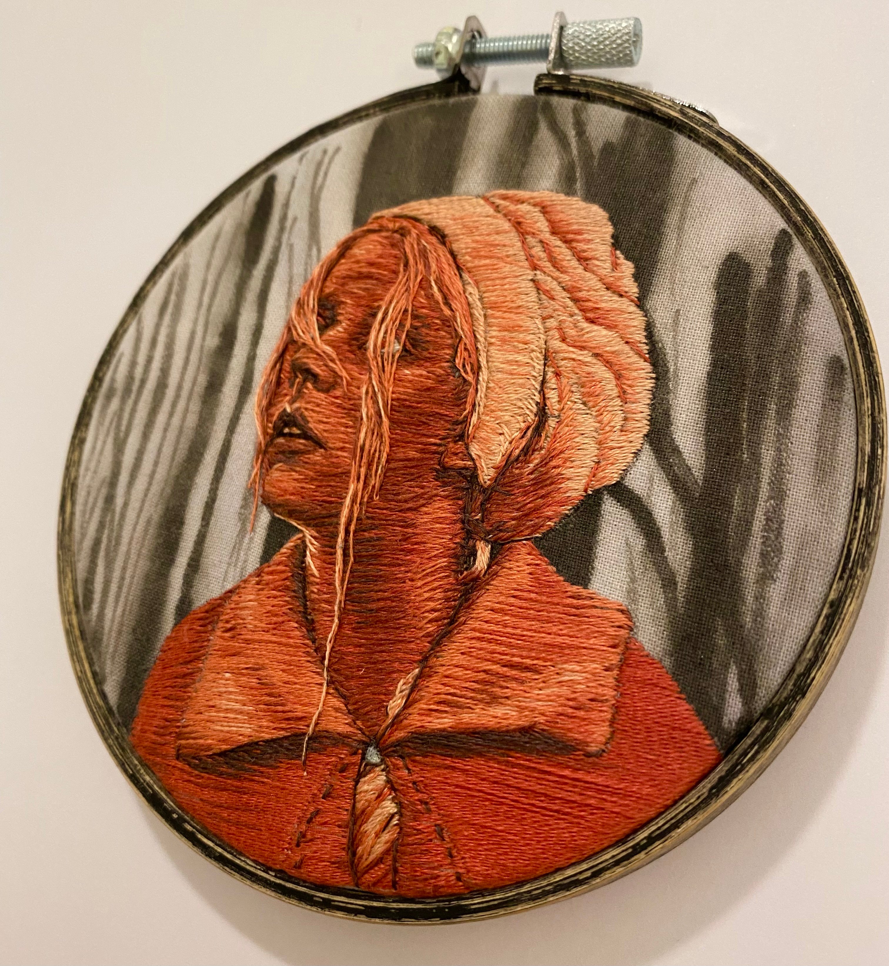 Hand embroidery on painted muslin mounted in a 4" wooden hoop and ready to hang.