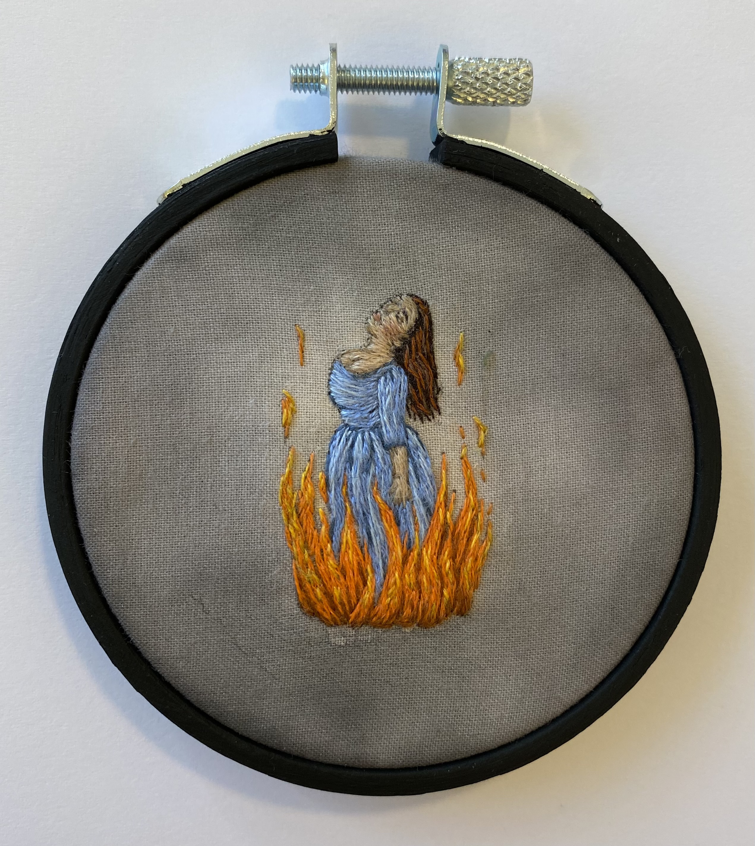 Hand embroidery on painted muslin, mounted in a 3" painted wooden hoop and ready to hang.