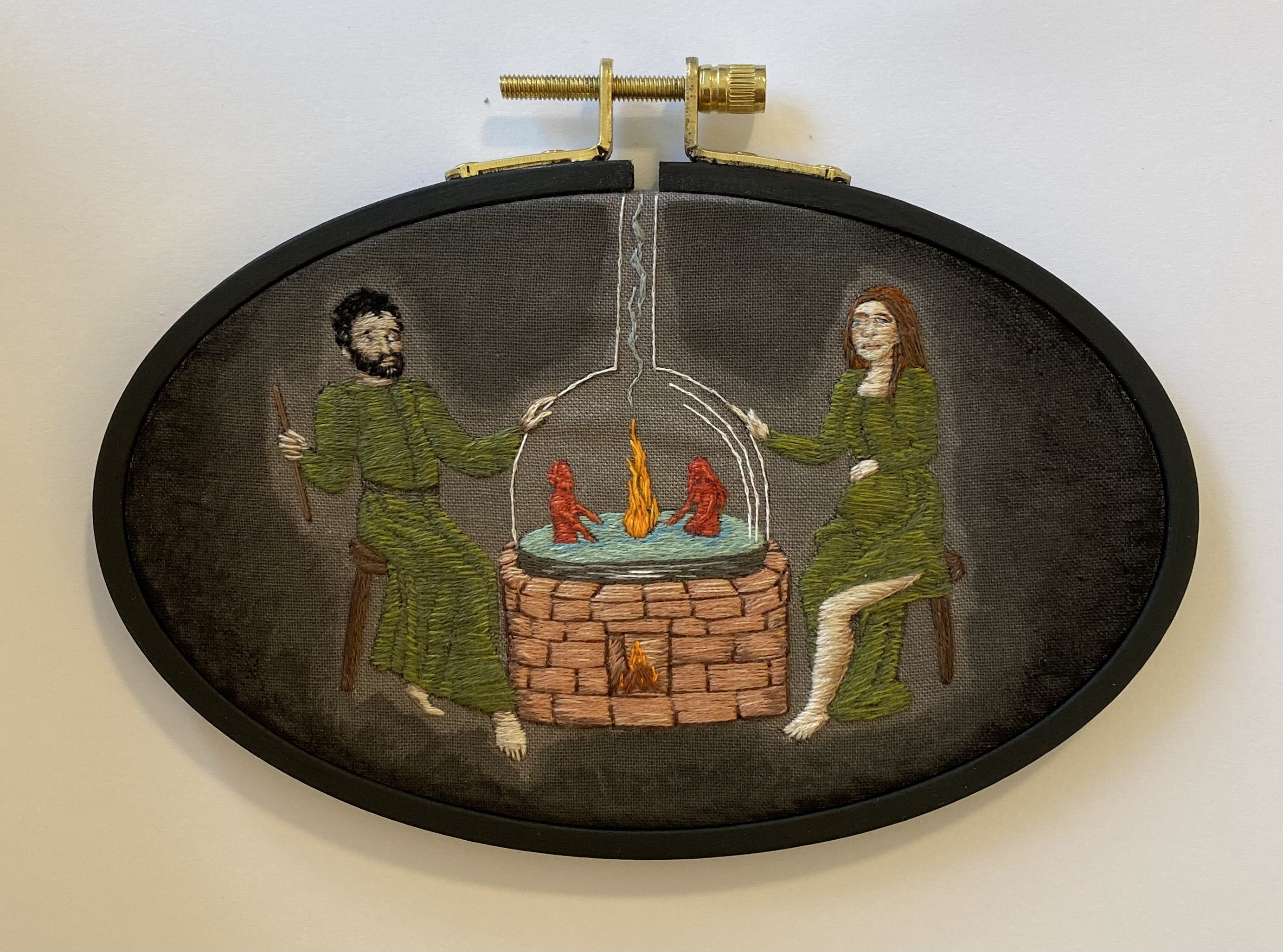 Hand embroidery on painted cotton, mounted in a 4"x6" painted wooden hoop and ready to hang.