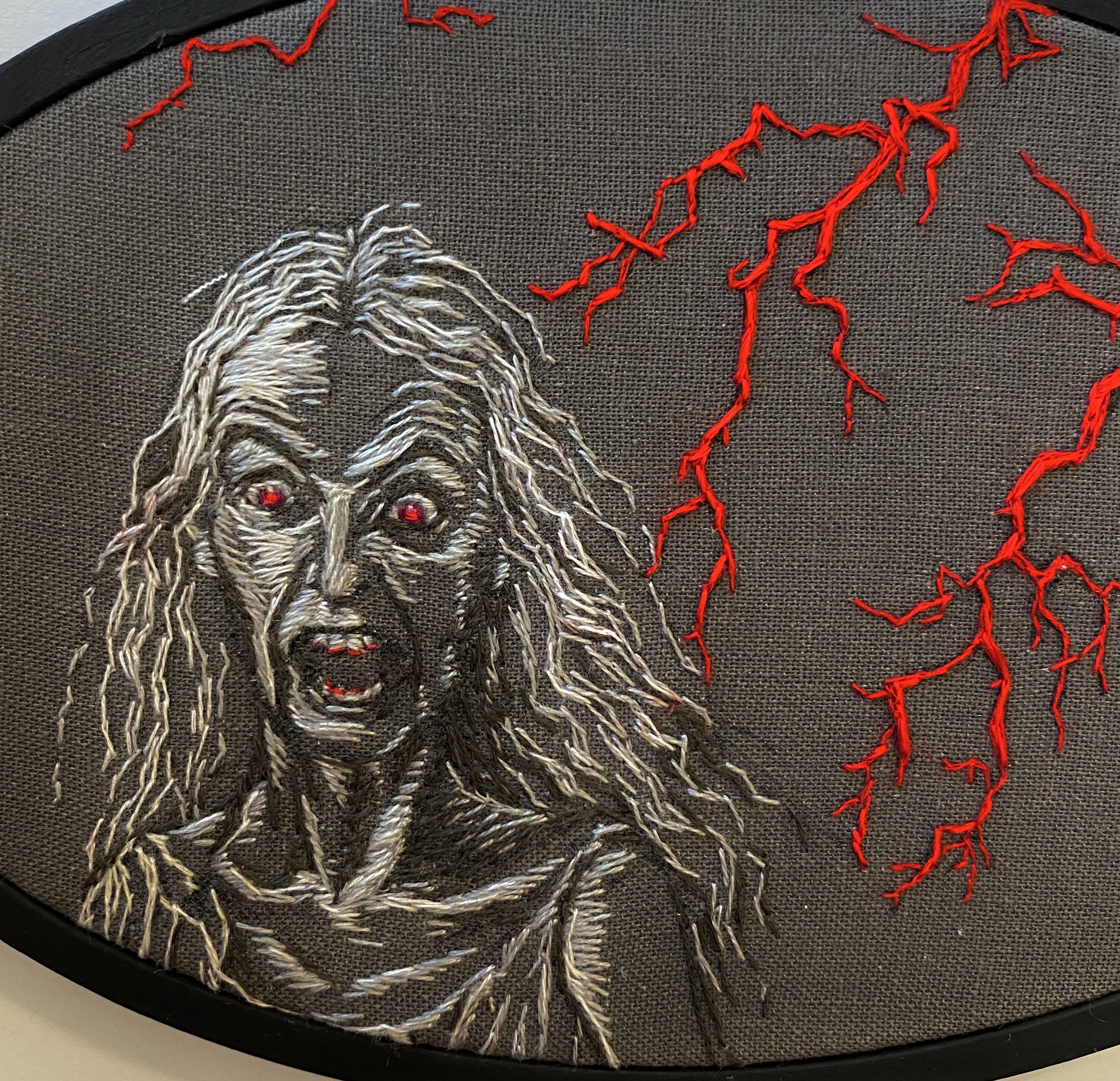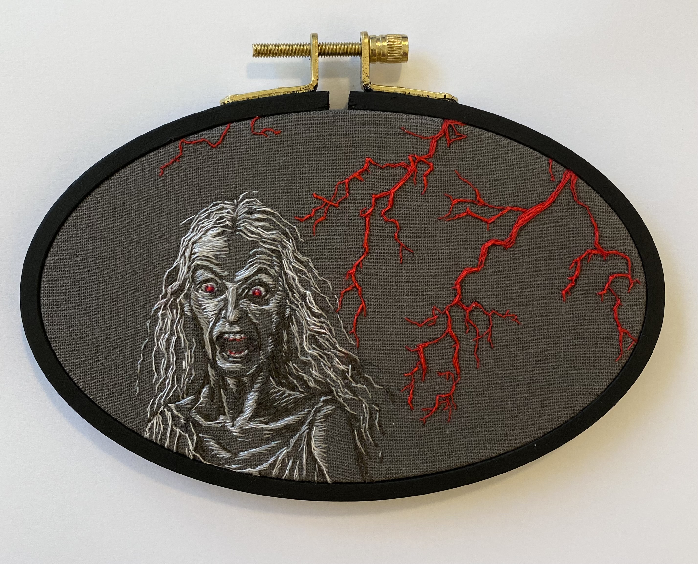 Hand embroidery on cotton, mounted in a 4"x6" painted wooden hoop and ready to hang.