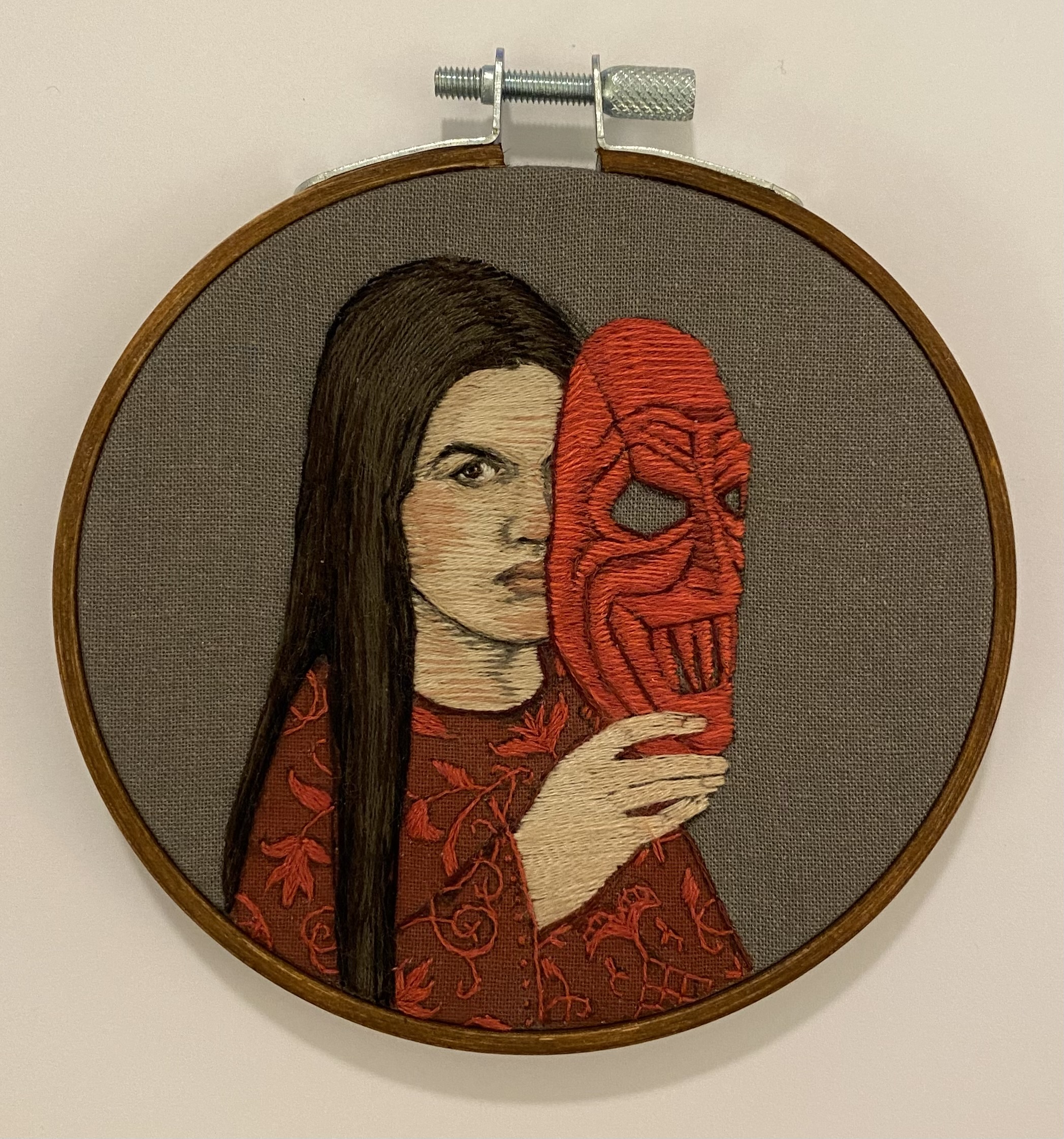 Hand embroidery on painted muslin, mounted in a painted 4" wooden hoop and ready to hang.