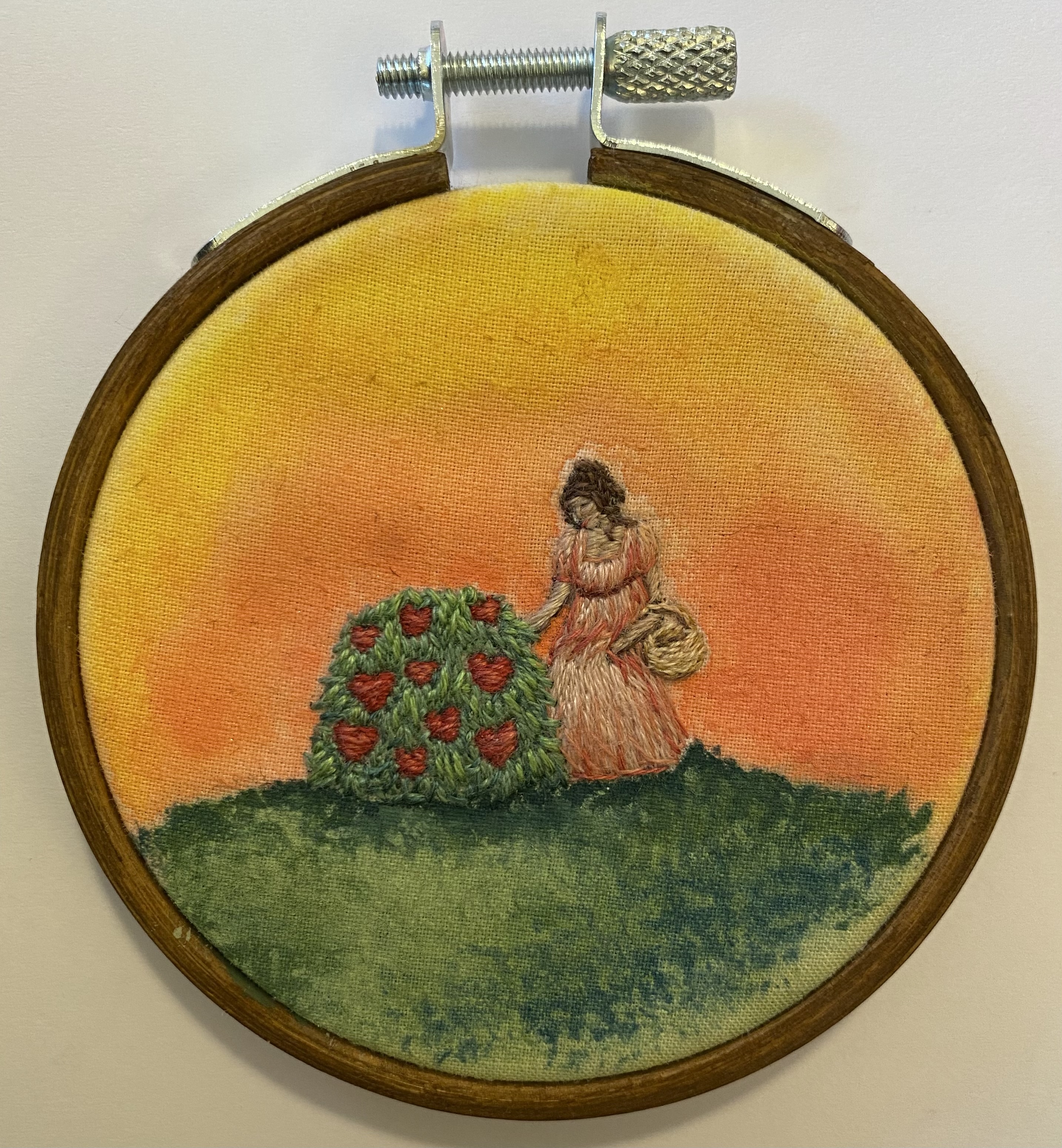 Hand embroidery on painted muslin, mounted in a 3" hoop and ready to hang.
