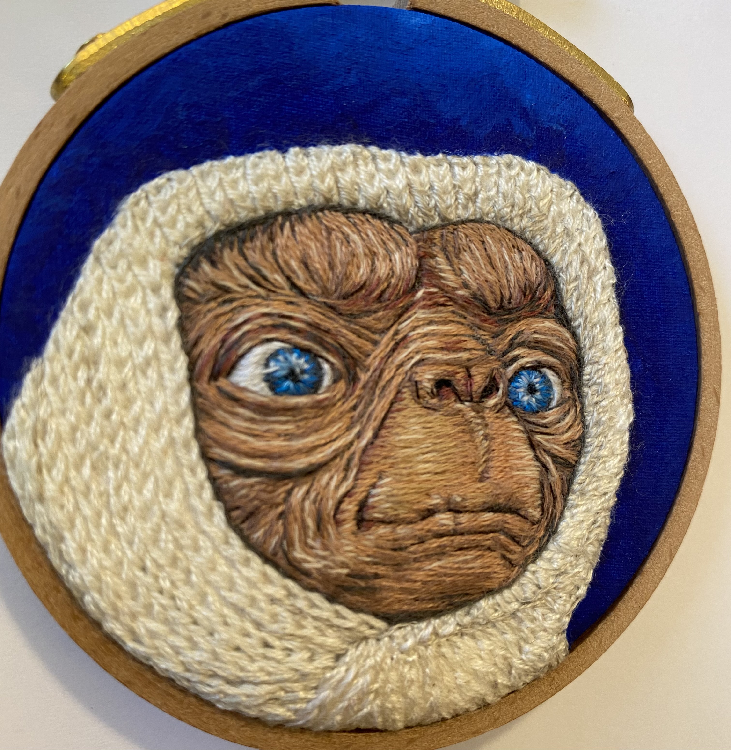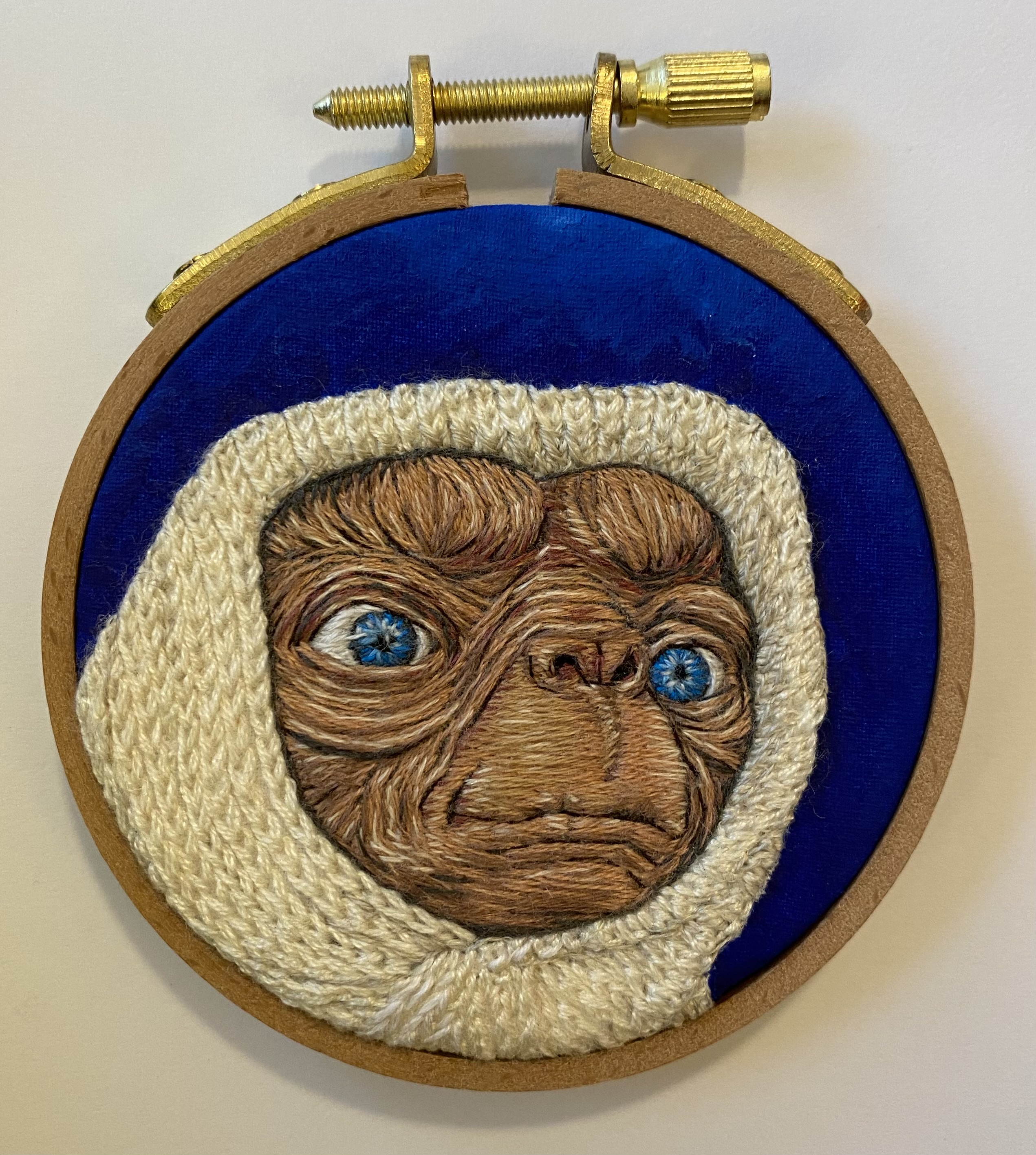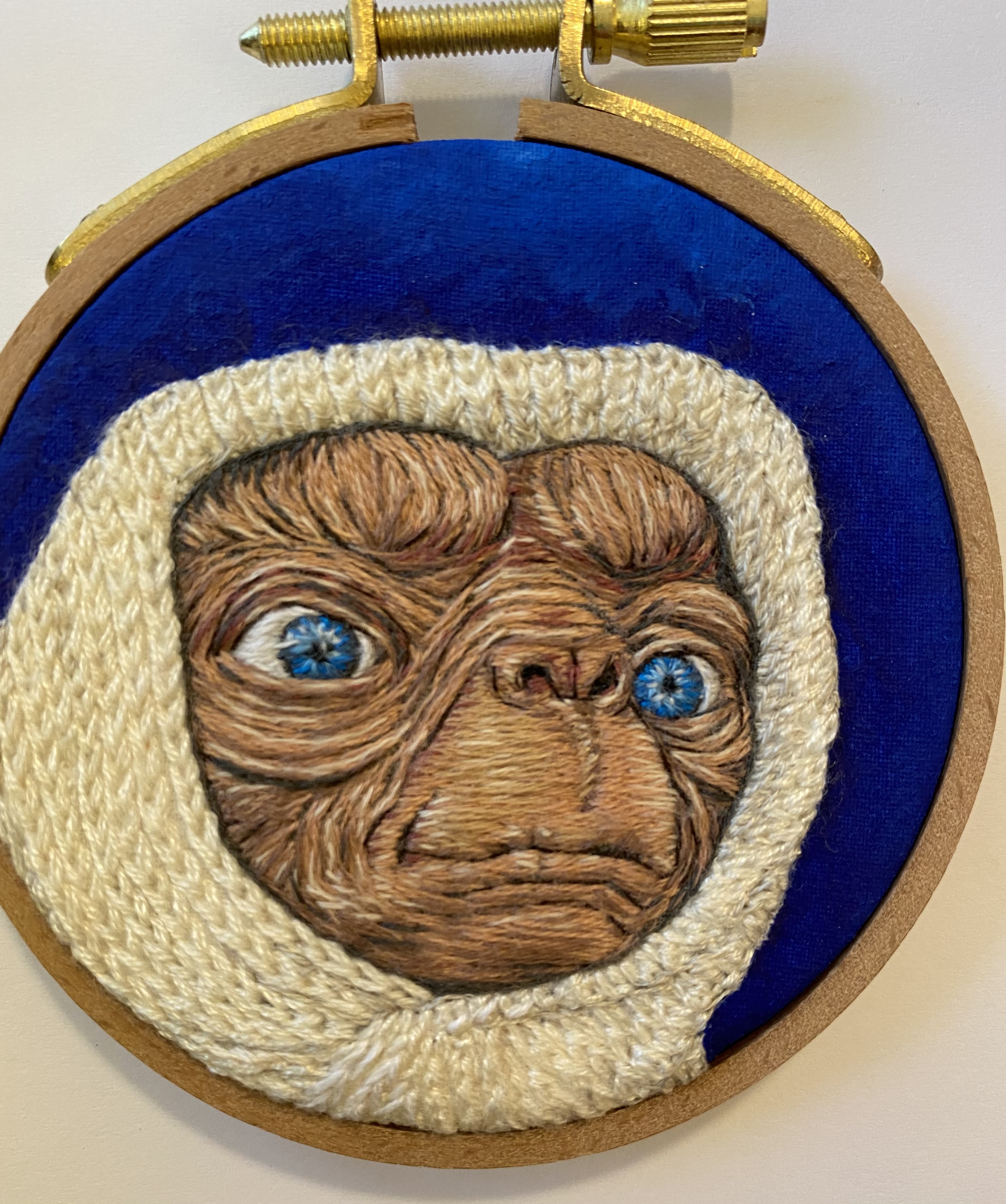 Hand embroidery on painted muslin, mounted in a 3" hoop and ready to hang.