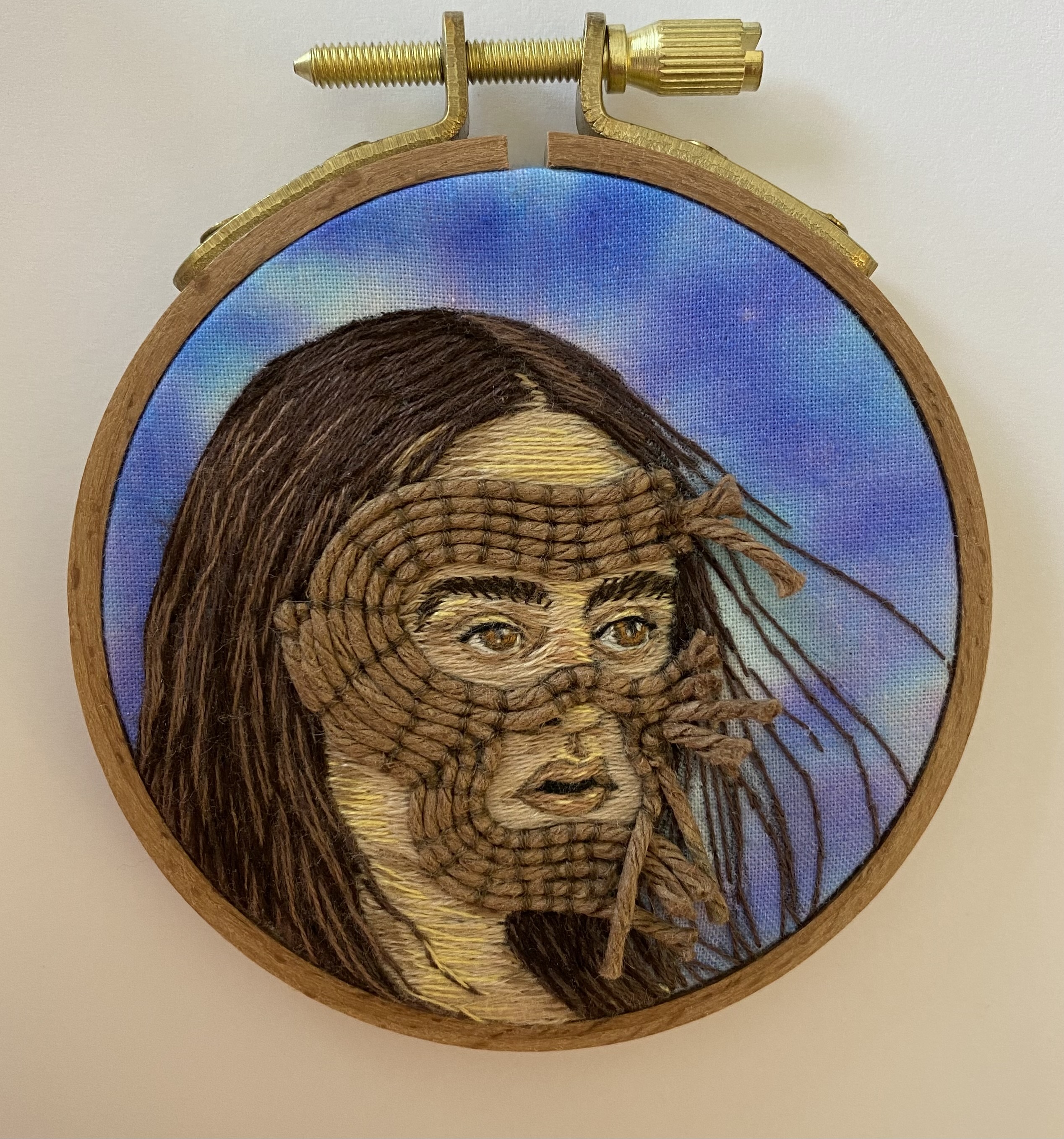 hand embroidery on painted muslin in a 3" wooden hoop ready to hang.