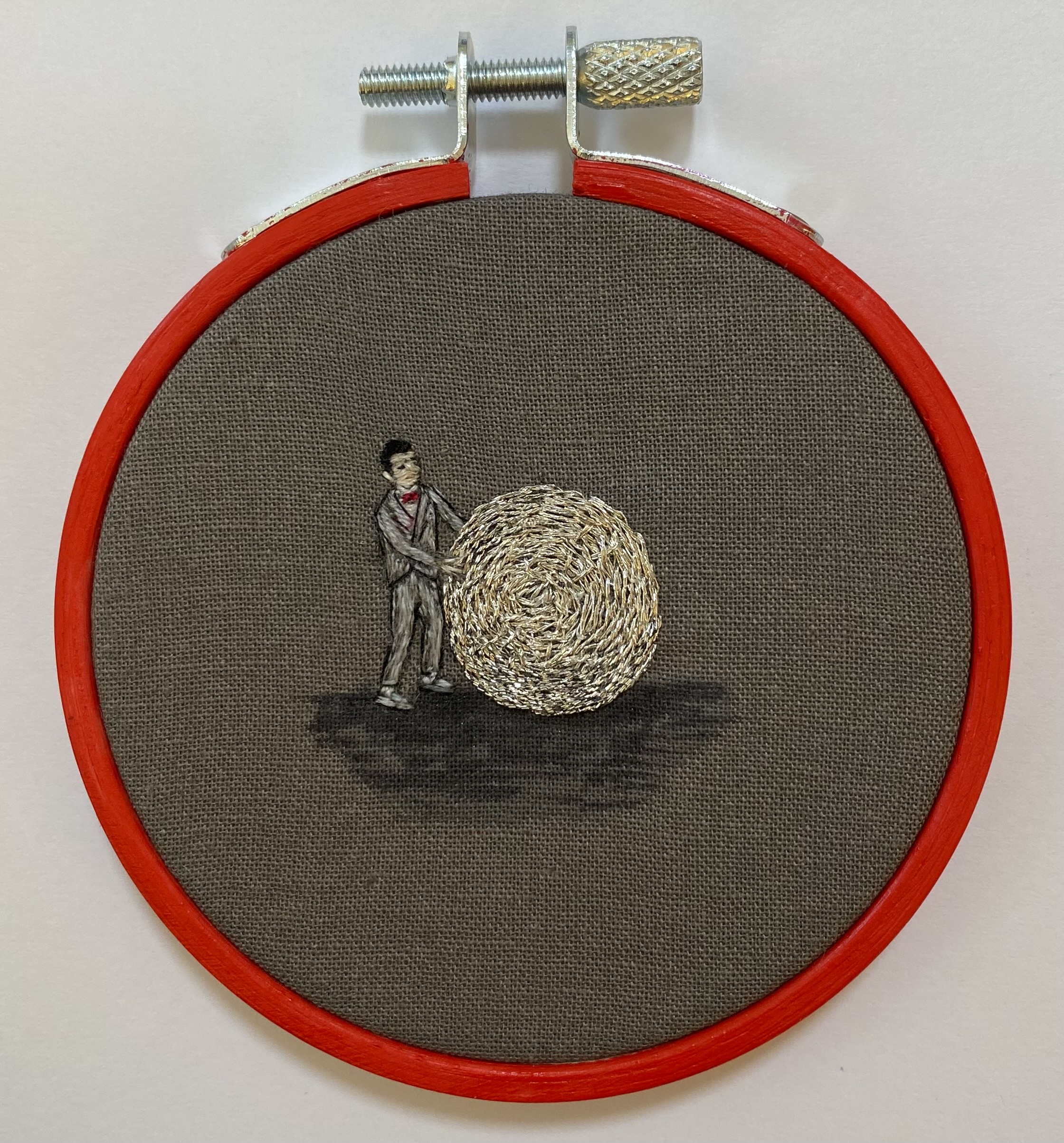 Hand embroidery on muslin, mounted in a 3" painted wooden hoop and ready to hang.