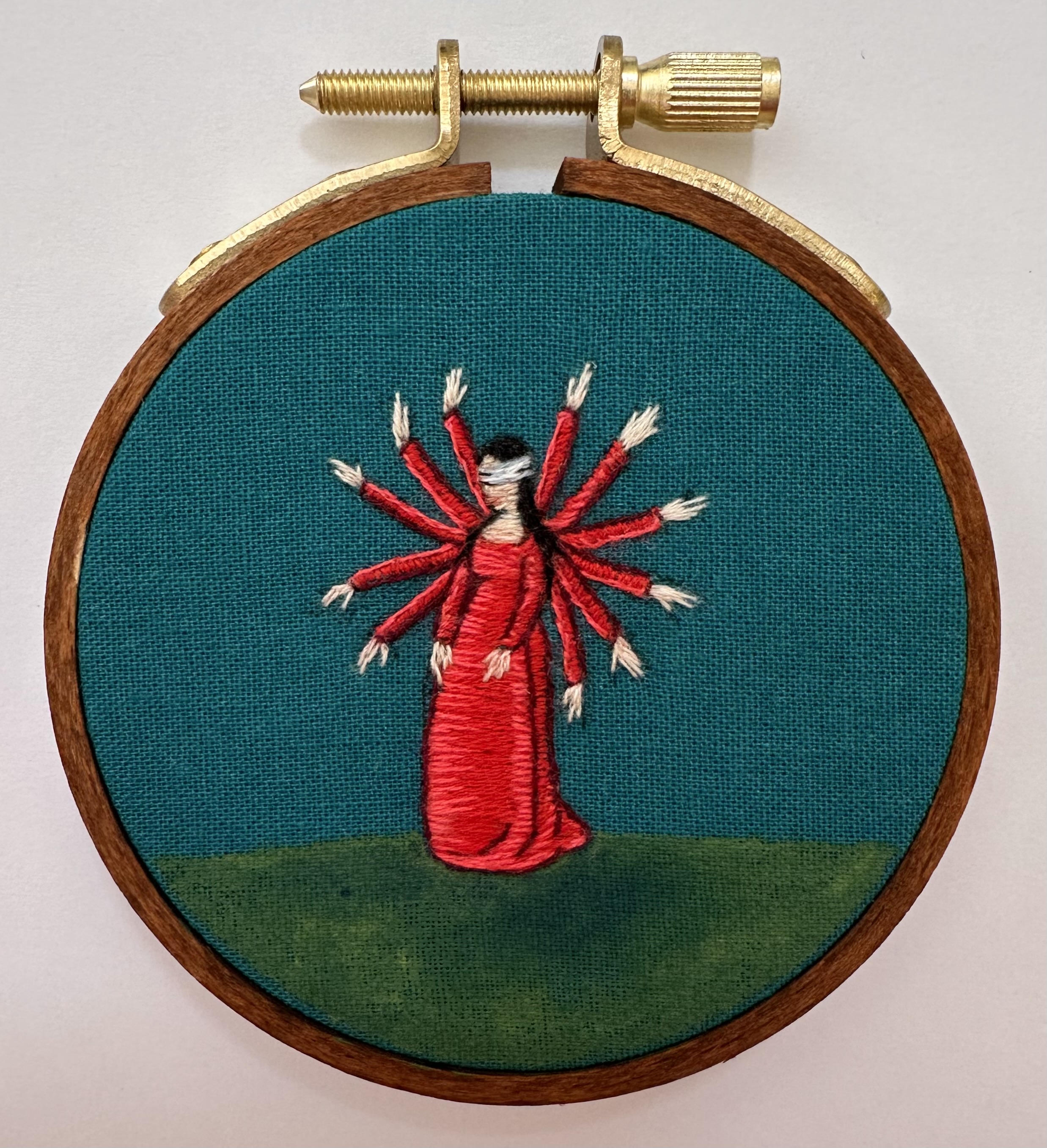 Hand embroidery on painted cotton, mounted in a 3" wooden hoop and ready to hang.