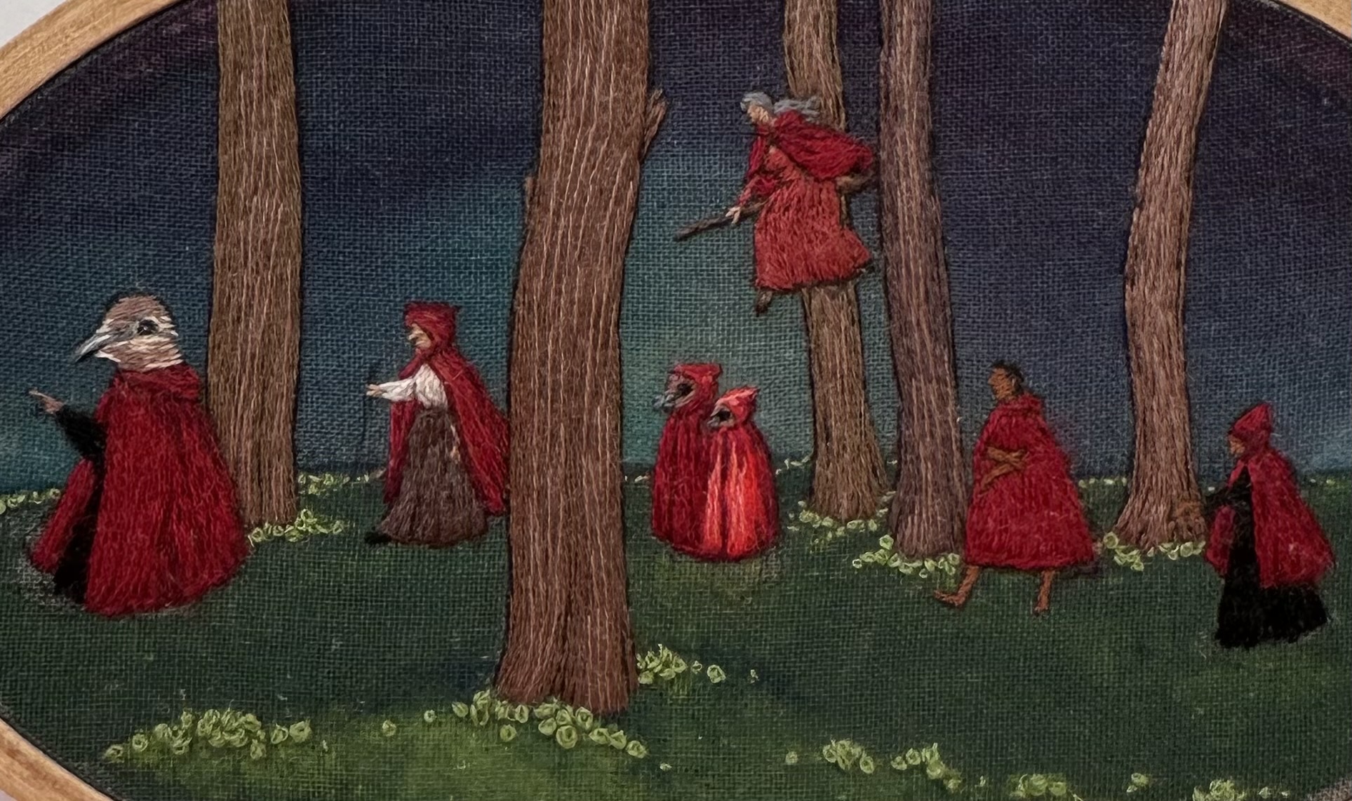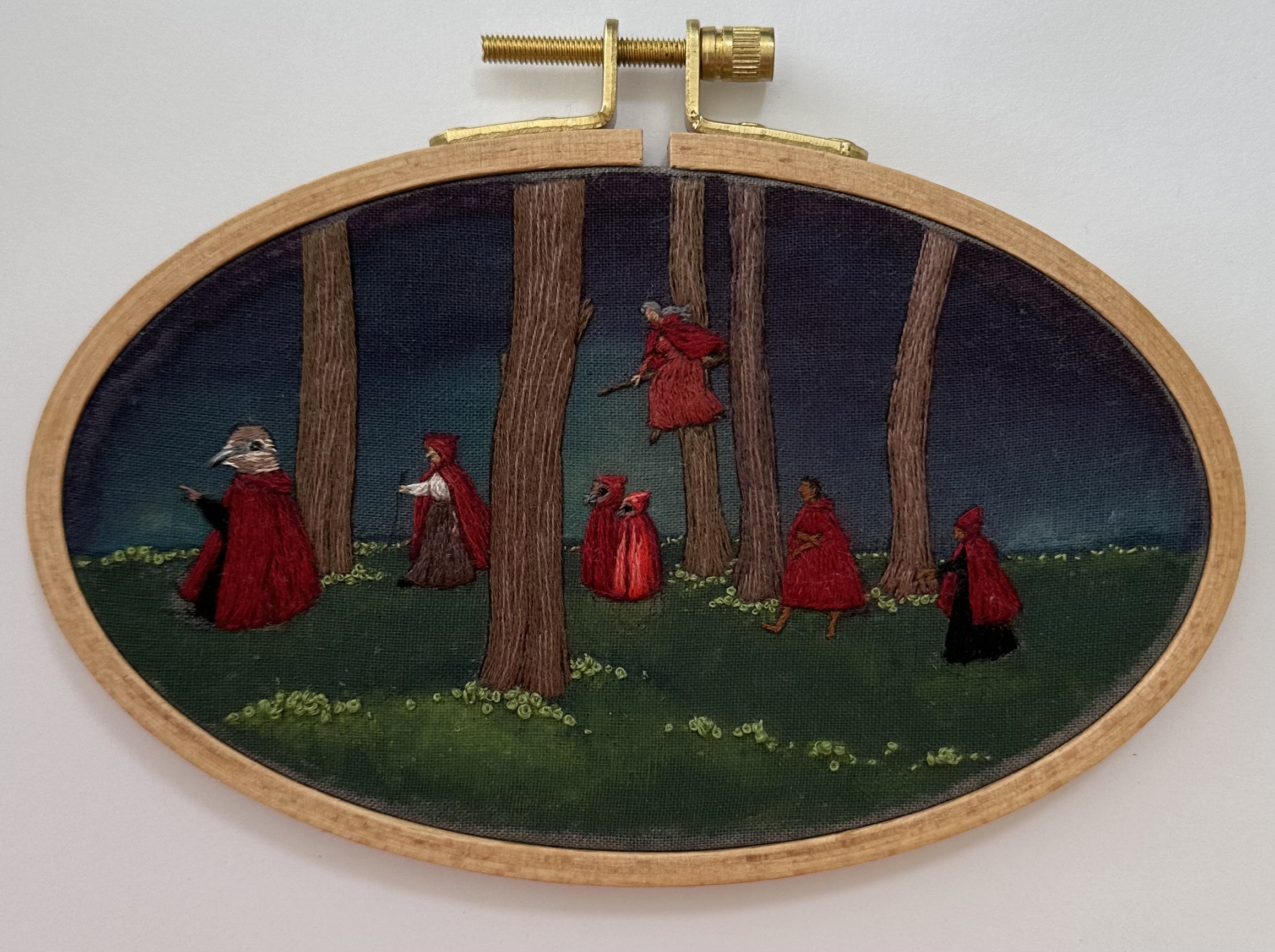 Hand embroidery on painted muslin, mounted in an oval hoop(4"x6") and ready to hang.