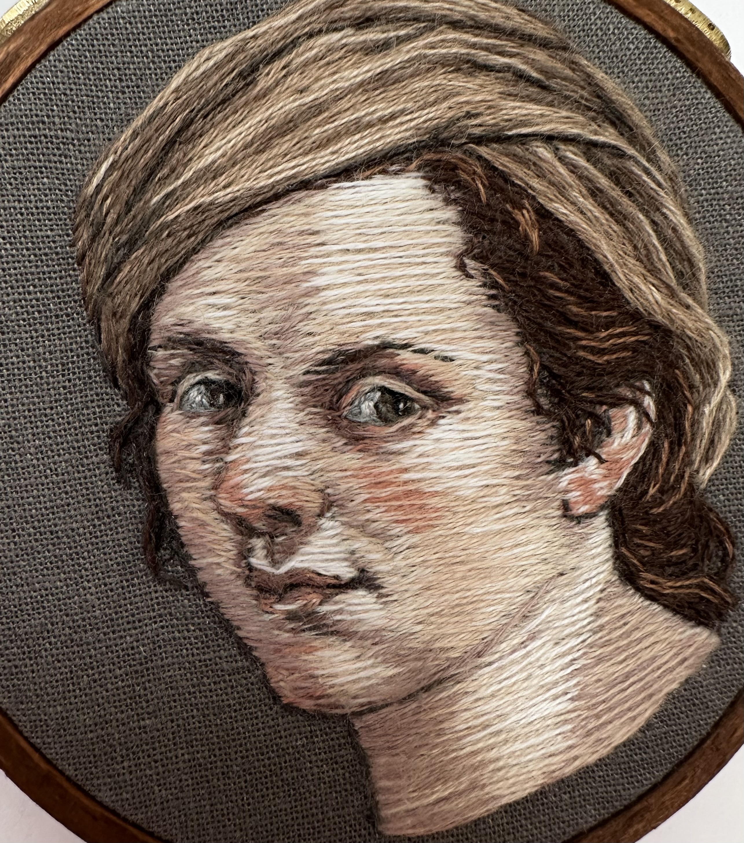 Hand embroidery of Artemisia Gentileschi on cotton, mounted in a 3" hoop and ready to hang.