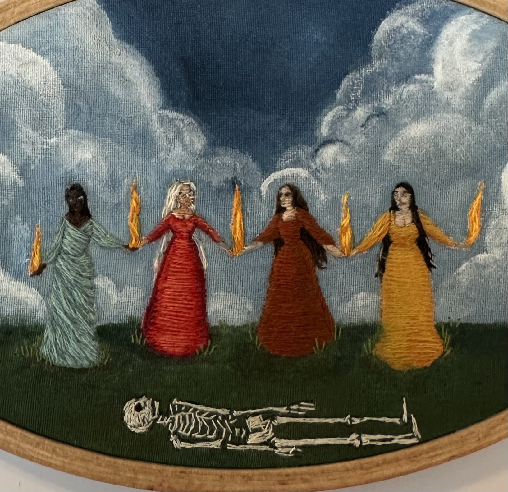 Hand embroidery on painted muslin, mounted in a 3"x5" wooden hoop and ready to hang.