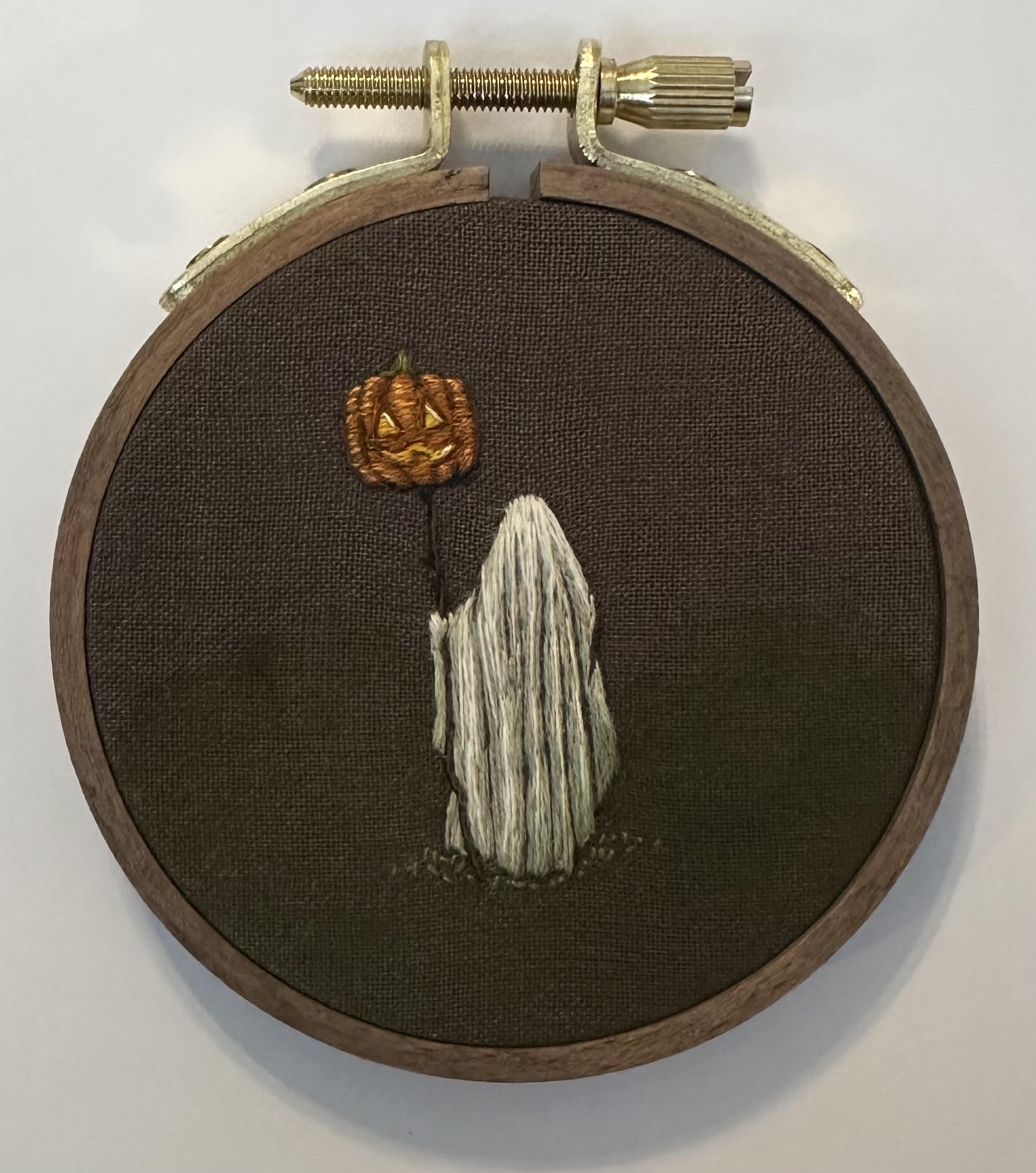 Hand embroidery on painted cotton, mounted in a 3" wooden hoop and ready to hang.