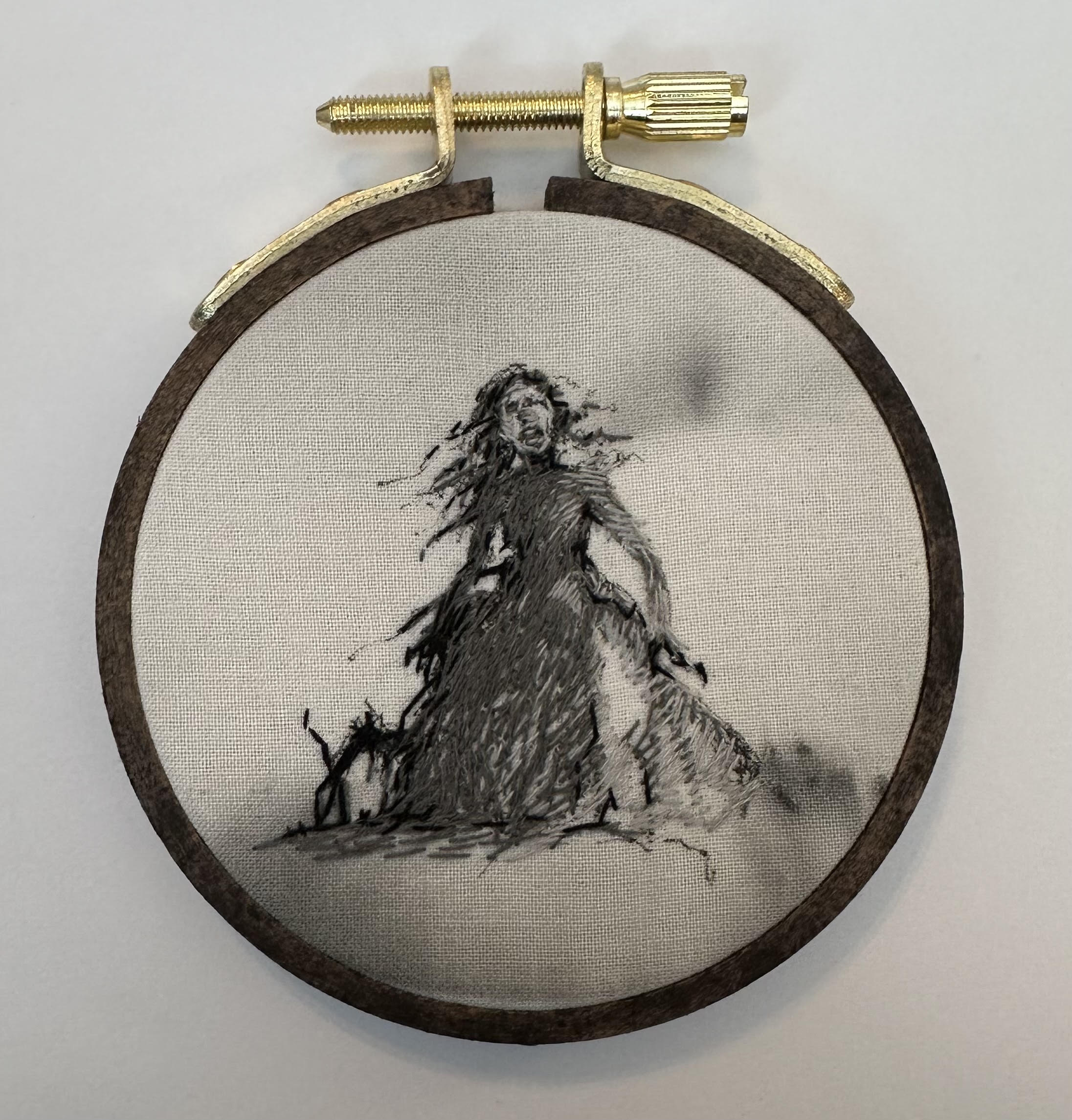 Hand embroidery on painted muslin, mounted in a 3" hoop and ready to hang.
