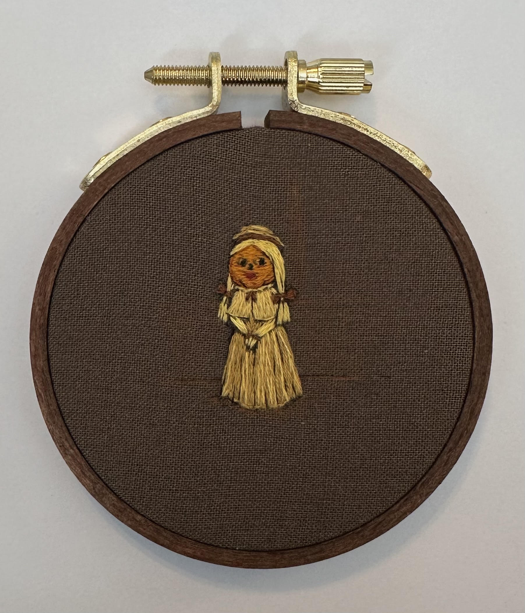 Hand embroidery on painted cotton, mounted in a 3" hoop and ready to hang.