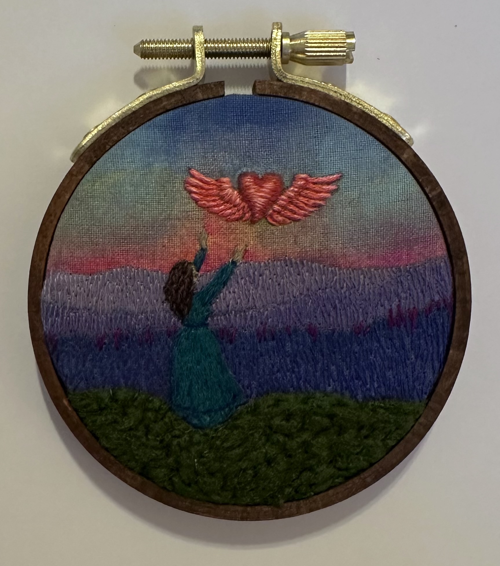 Hand embroidery on painted muslin, mounted in a 3" hoop and ready to hang.
