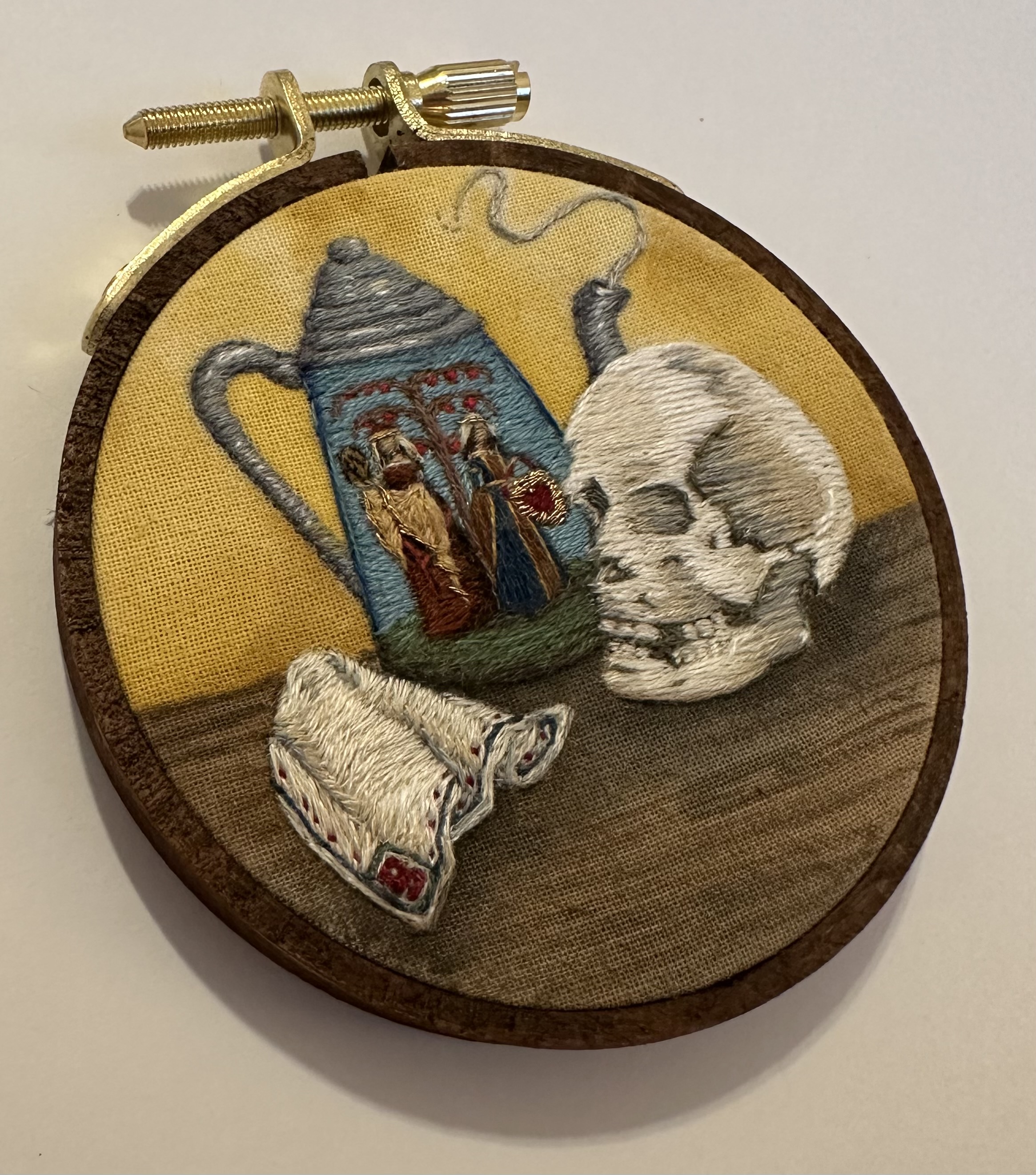 Hand embroidery on painted muslin, mounted in a 3" hoop and ready to hang.