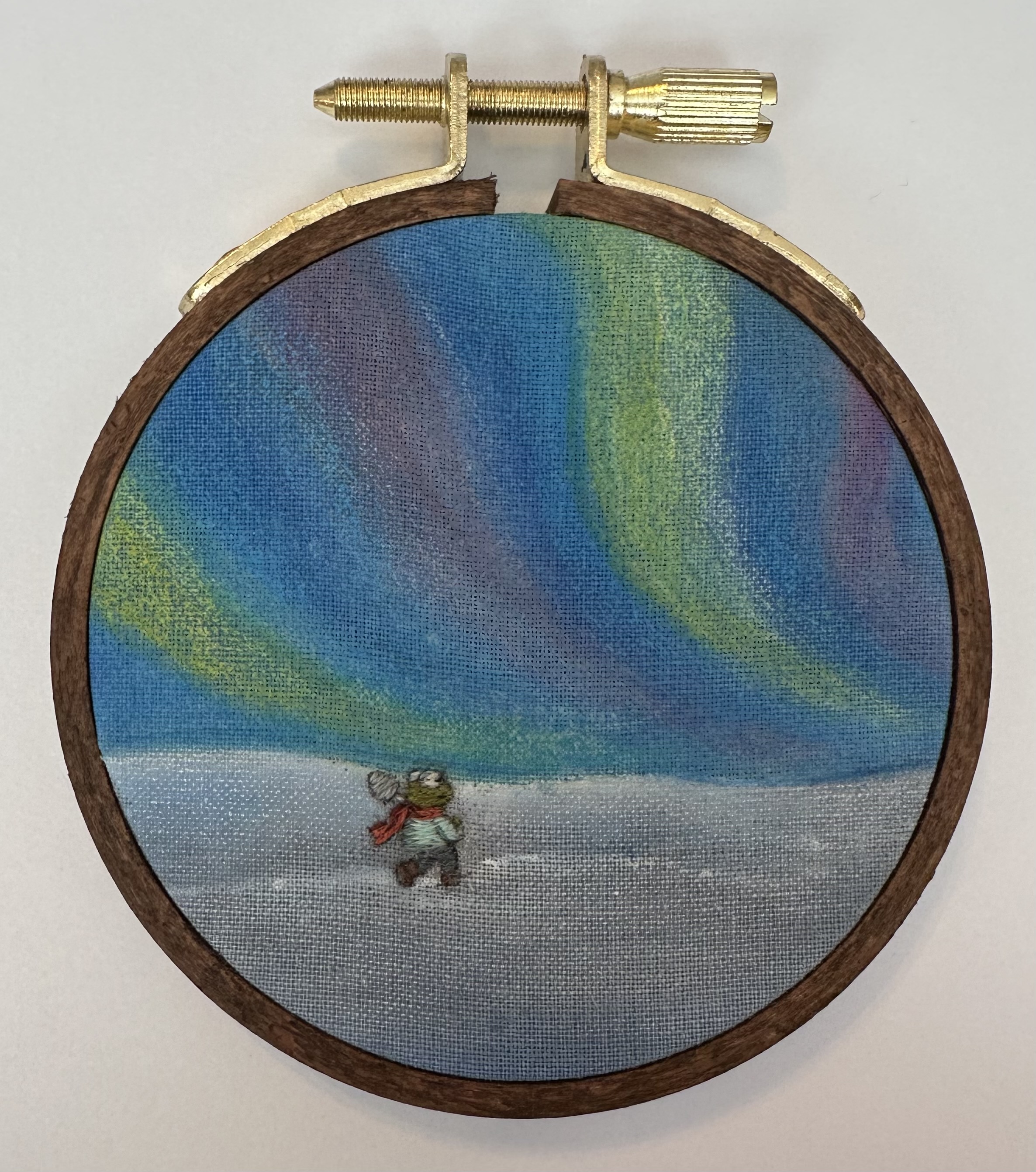 Hand embroidery on painted muslin, mounted in a 3" wooden hoop and ready to hang.