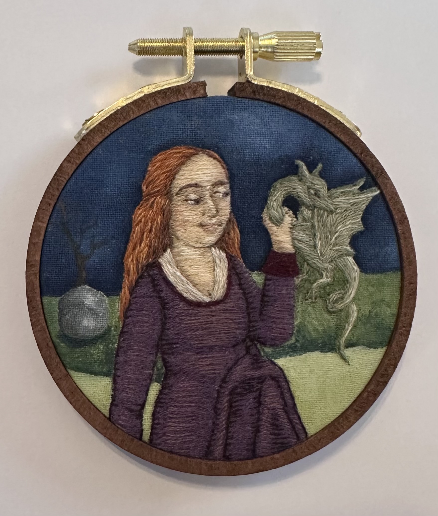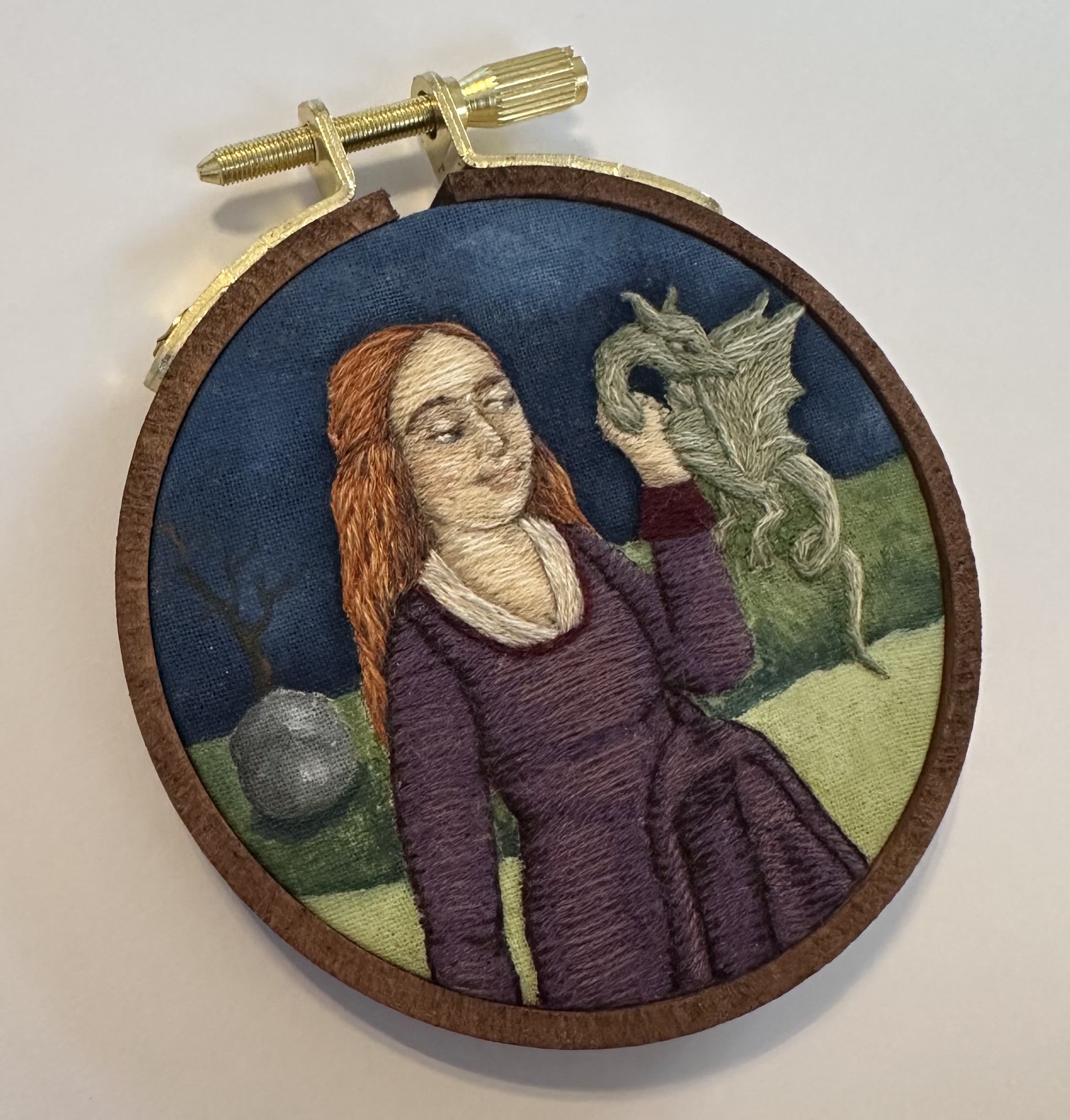 Hand embroidery on painted muslin, mounted in a 3" hoop and ready to hang.