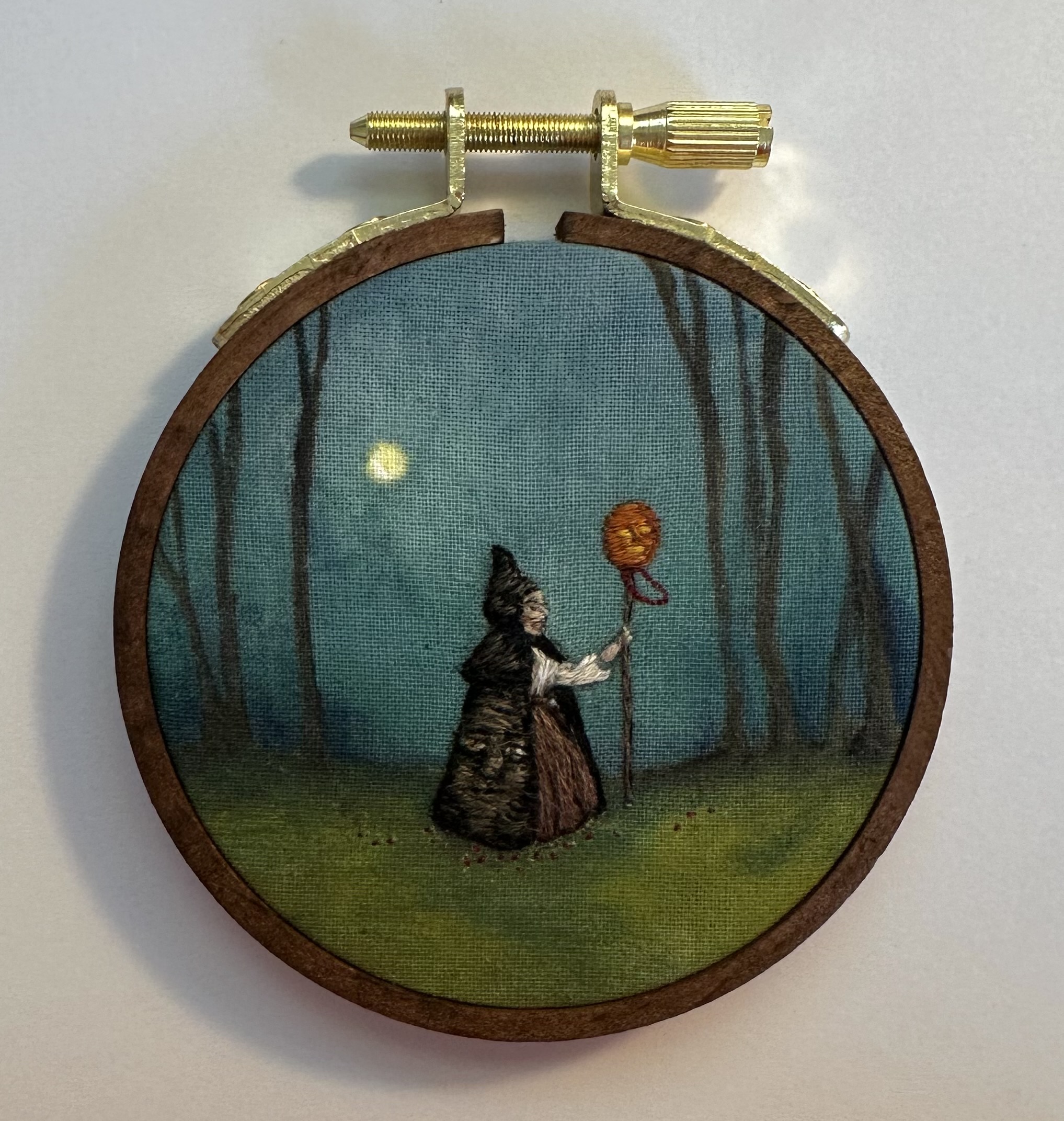 Hand embroidery on painted muslin, mounted in a 3" hoop and ready to hang.